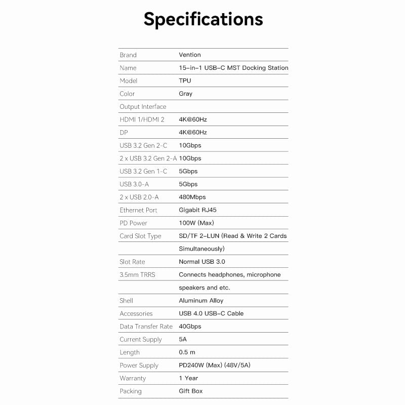 Vention 15-in-1 TPU là giải pháp docking station cao cấp, biến một cổng USB-C duy nhất thành 15 cổng kết nối đa năng, đáp ứng nhu cầu xuất hình đa màn hình, truyền dữ liệu tốc độ cao, kết nối mạng ổn định và sạc nhanh laptop. Đây là lựa chọn lý tưởng cho dân văn phòng, designer, streamer và game thủ muốn tối ưu không gian làm việc.