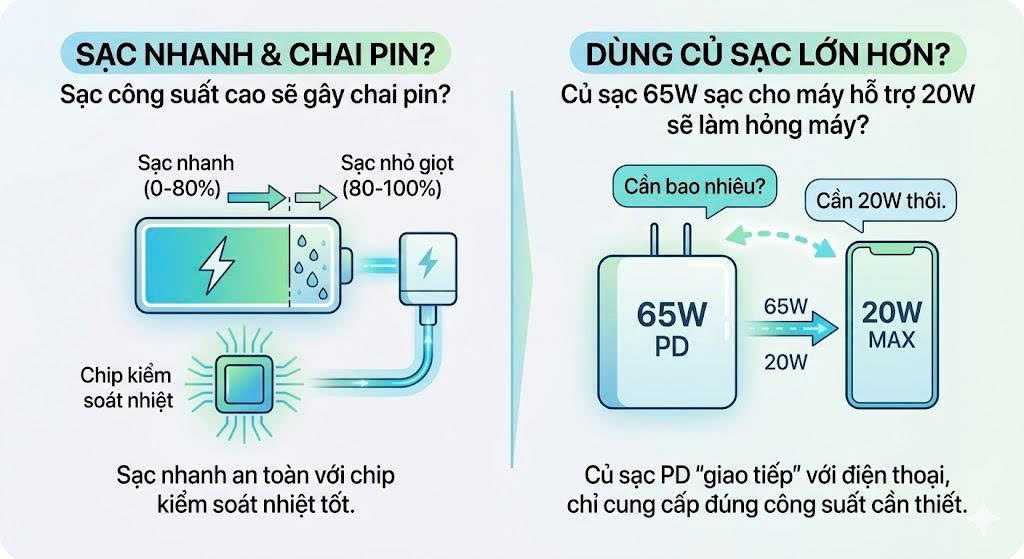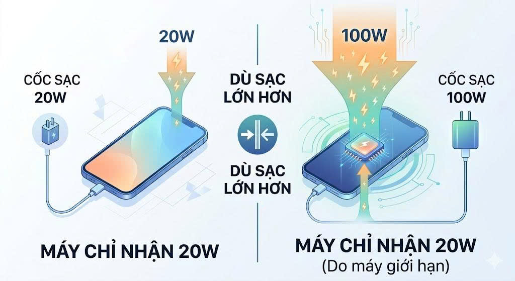 Sự thật: Các củ sạc hiện đại (đặc biệt là chuẩn Power Delivery) có khả năng "giao tiếp" với điện thoại. Củ sạc sẽ hỏi: "Bạn cần bao nhiêu?", và điện thoại trả lời: "Tôi cần 20W". Lúc này, củ sạc 65W sẽ chỉ cung cấp đúng 20W. Bạn hoàn toàn có thể dùng sạc Laptop cho điện thoại mà không cần lo lắng.