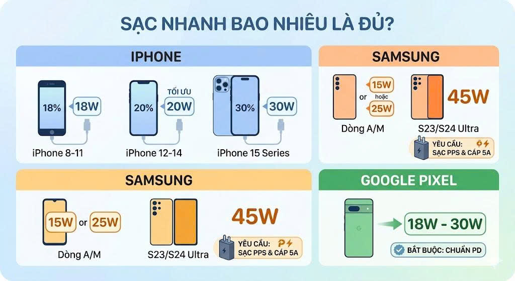 Sạc nhanh bao nhiêu là đủ cho từng dòng điện thoại?