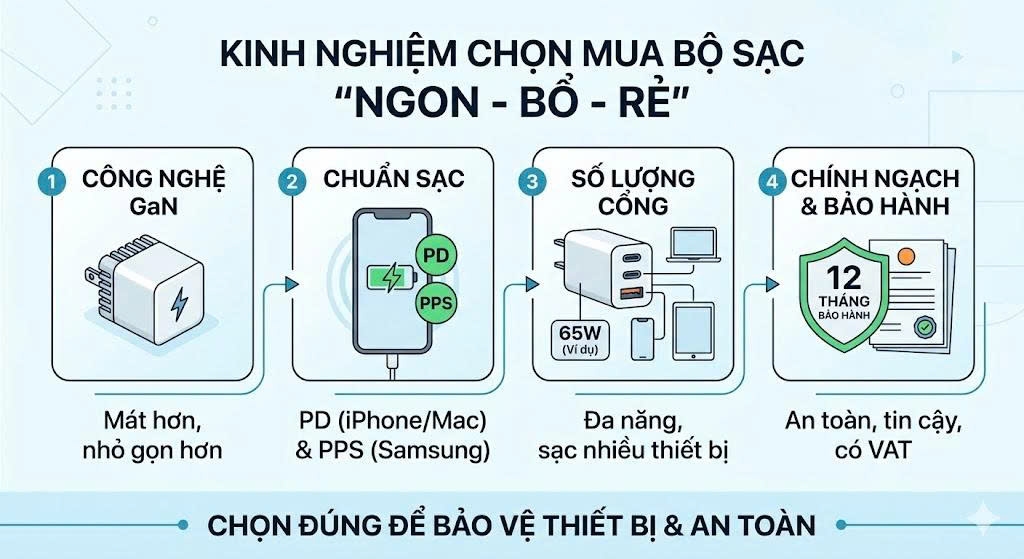Bài viết này sẽ cung cấp cái nhìn chi tiết và chuyên sâu nhất để bạn trở thành chuyên gia trong việc lựa chọn phụ kiện sạc cho thiết bị của mình.