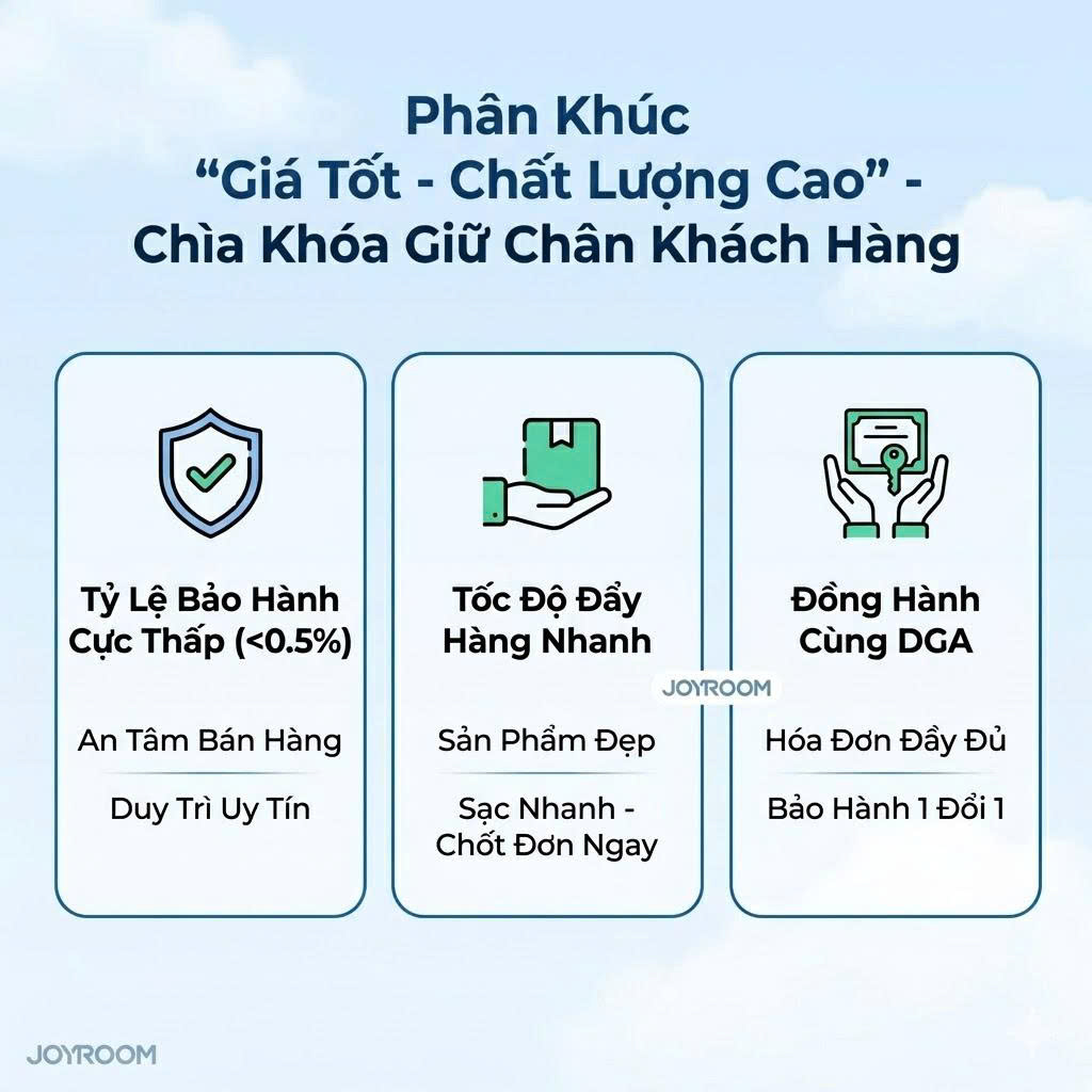 Tỷ lệ bảo hành cực thấp: Nhập hàng rẻ tiền có thể lời nhiều lúc đầu, nhưng chi phí bảo hành và mất uy tín sẽ khiến bạn lỗ nặng. Với Joyroom, tỷ lệ lỗi dưới 0.5% giúp bạn thảnh thơi bán hàng.