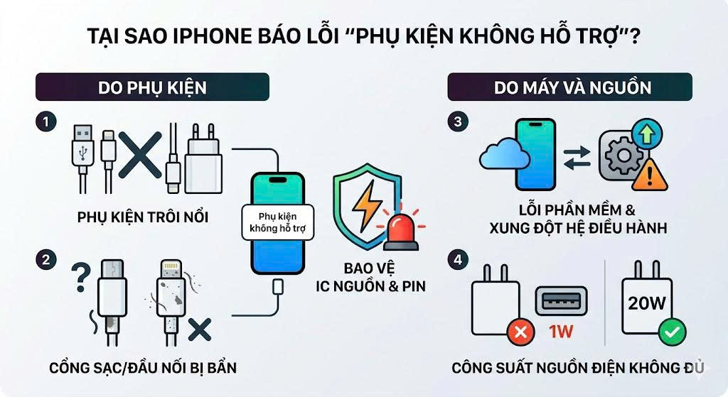 Thông báo này là một cơ chế bảo vệ thông minh của Apple nhằm ngăn chặn các phụ kiện kém chất lượng gây hư hỏng cho chip quản lý nguồn (IC nguồn) hoặc cháy nổ pin. Có 4 nhóm nguyên nhân chính: