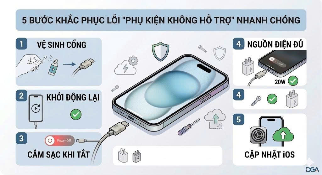 Lỗi "Phụ kiện không hỗ trợ" trên iPhone phần lớn đến từ vấn đề vệ sinh hoặc chất lượng phần cứng của cáp sạc. Bằng việc trang bị cho mình những kiến thức kiểm tra cơ bản và lựa chọn đơn vị cung cấp uy tín như DGA, bạn sẽ hoàn toàn yên tâm tận hưởng trải nghiệm công nghệ đỉnh cao mà không bị gián đoạn.