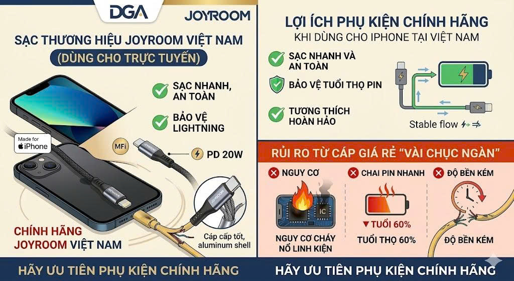 Tại DGA, chúng tôi luôn khuyến nghị khách hàng lựa chọn các dòng phụ kiện từ những thương hiệu lớn như Joyroom, nơi sản phẩm được kiểm tra nghiêm ngặt về độ tương thích và an toàn theo tiêu chuẩn quốc tế.