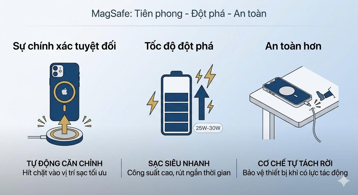Tốc độ đột phá: Đến năm 2026, các dòng iPhone mới nhất (như iPhone 17 Pro) đã nâng công suất sạc MagSafe lên mức 25W - 30W, thu hẹp đáng kể khoảng cách với sạc dây truyền thống.