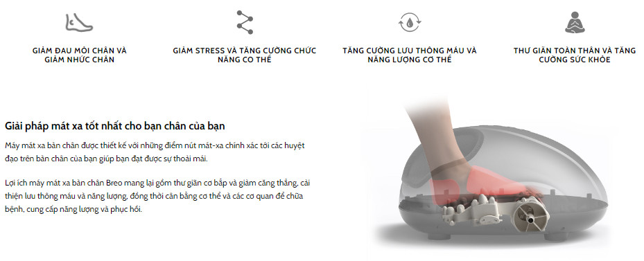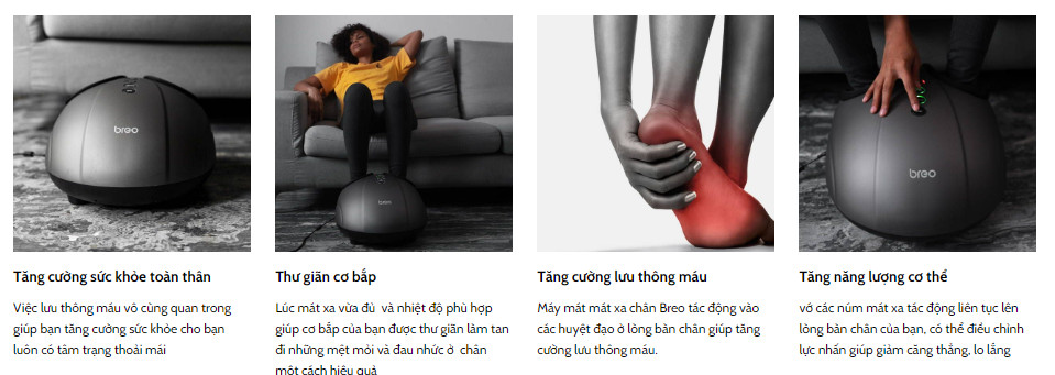 Máy mát xa chân Breo có các chức năng xoa bóp sâu, nén, cạo, lăn, sưởi ấm. Máy mát xa bấm huyệt này có thể giúp kích thích các dây thần kinh và cải thiện lưu thông máu để thư giãn đôi chân đau nhức, mệt mỏi sau cả ngày làm việc hoặc đứng.