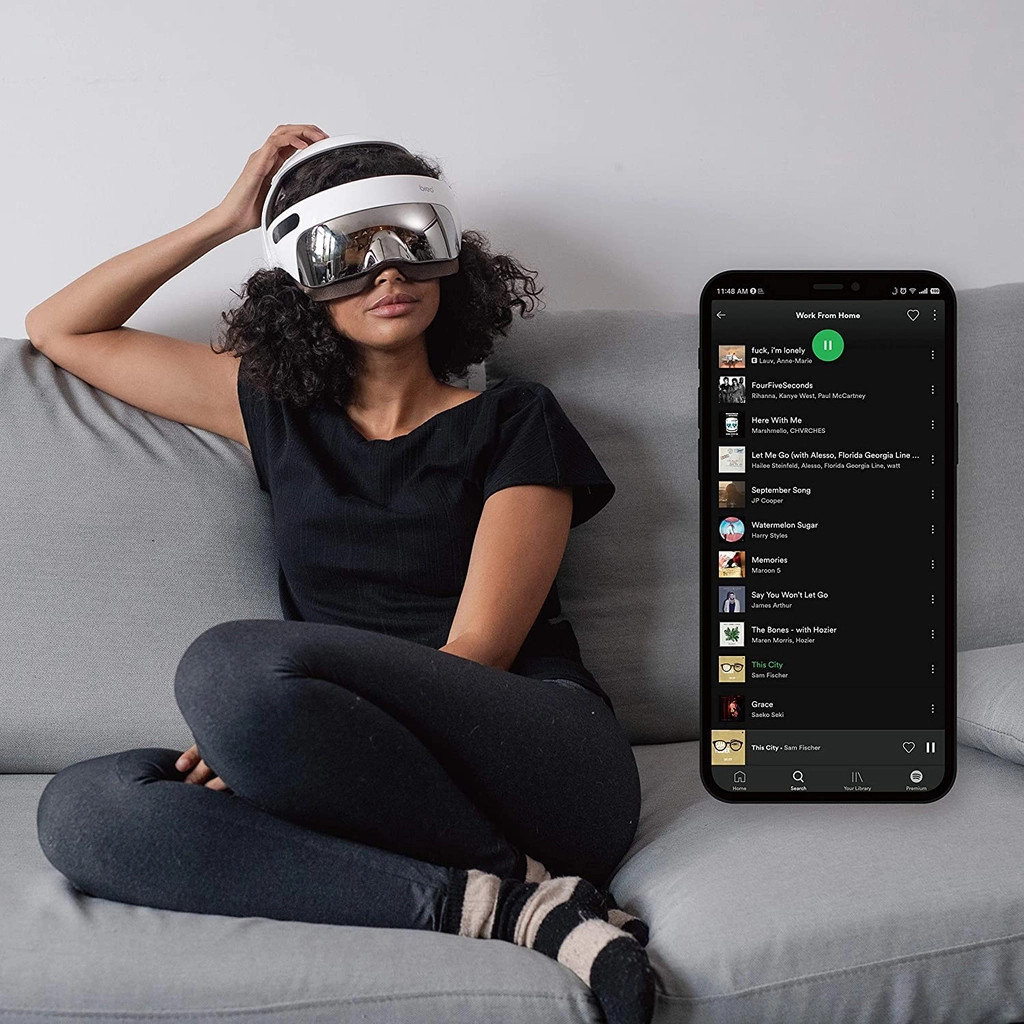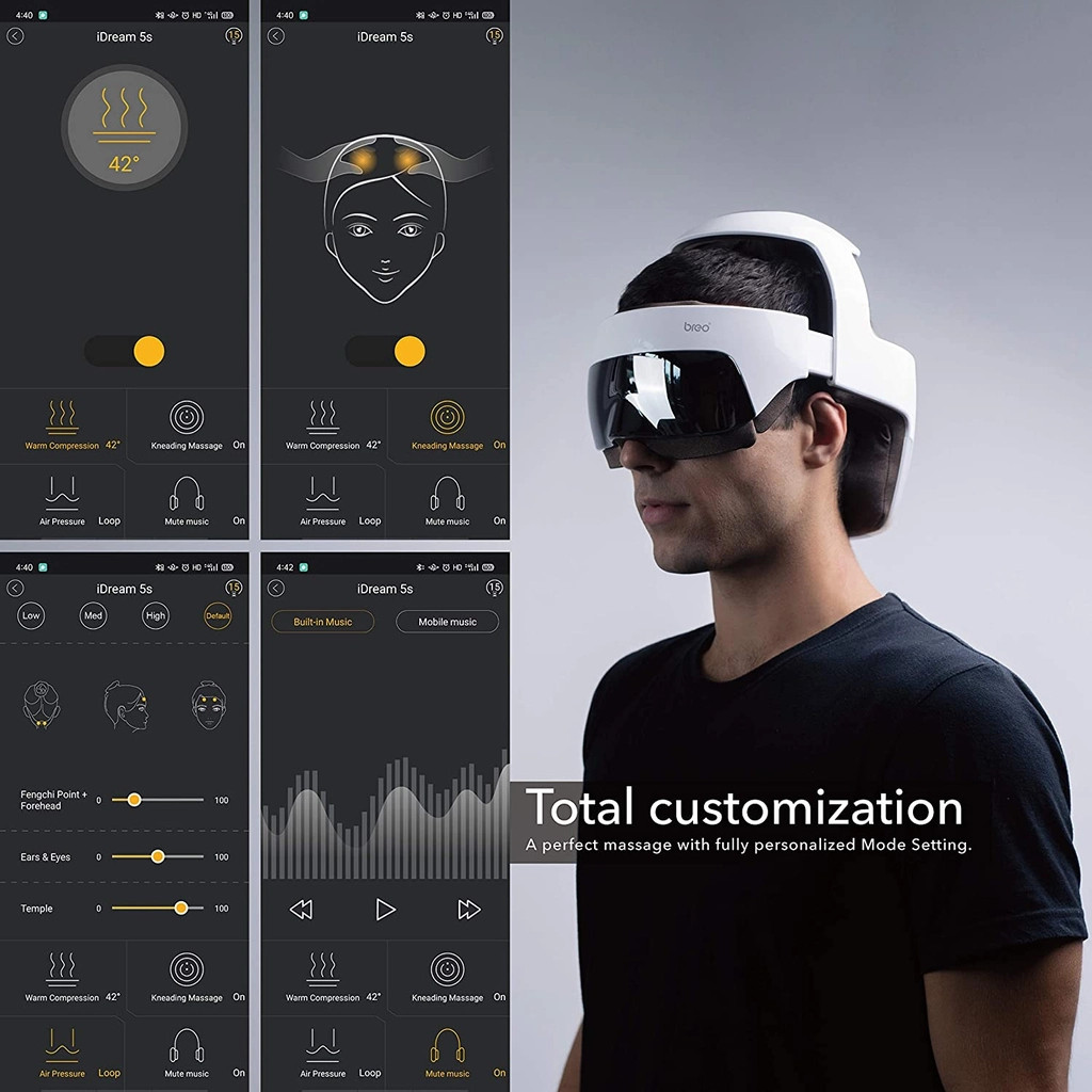 THỜI GIAN 90MIN & ĐIỀU KHIỂN ỨNG DỤNG Breo CÓ THỂ TẢI XUỐNG: Tích hợp pin lithium có thể sạc lại cho phép bạn tận hưởng mát-xa đầu và mắt không dây. Một lần sạc đầy hỗ trợ sử dụng trong 1 tuần (15 phút mỗi ngày). Dưới sự điều khiển của ứng dụng, các địa chỉ liên lạc và cường độ massage có thể được điều chỉnh dễ dàng.