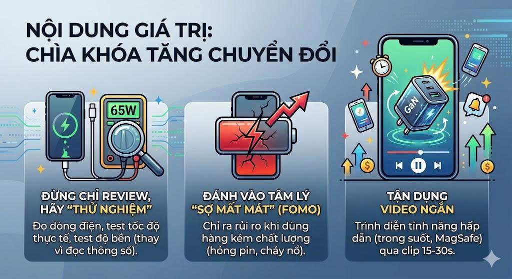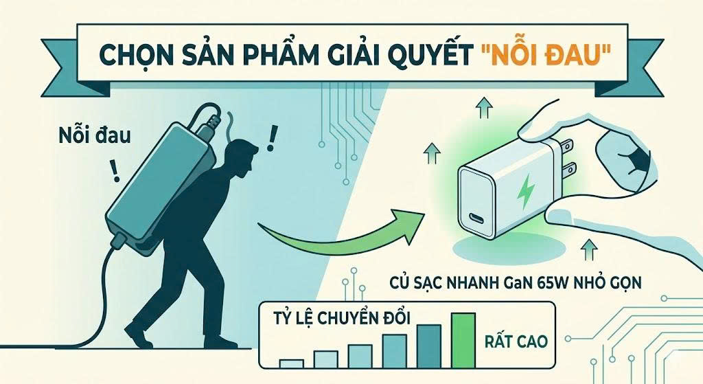 Thay vì nói "Sản phẩm này rất tốt", hãy nói "Bạn đang làm hỏng pin iPhone mỗi ngày nếu vẫn dùng bộ sạc không chuẩn CCC này". Việc chỉ ra rủi ro khi không sử dụng sản phẩm chất lượng là đòn bẩy tâm lý cực mạnh.