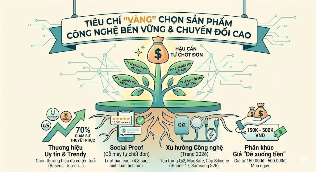 Năm 2026, đừng đi làm Affiliate cho sạc Micro-USB hay những sợi cáp không hỗ trợ sạc nhanh. Hãy tập trung vào: