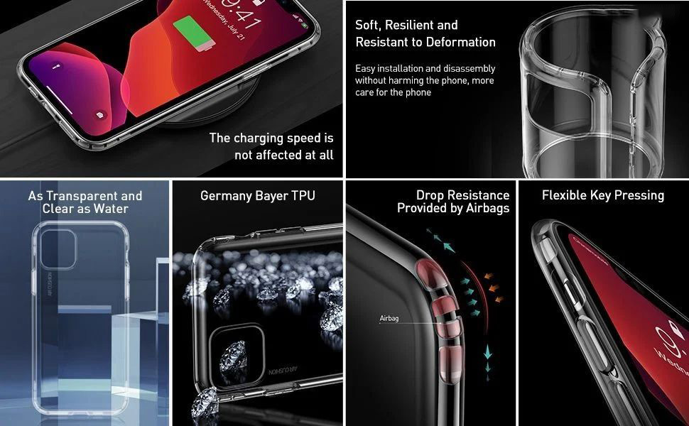 - Với chất liệu Silicone trong suốt Baseus Airbags Case có phong cách thiết kế đơn giản trẻ và tiện dụng chuyên dùng cho iPhone 11 Series .