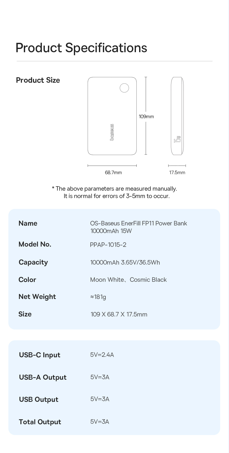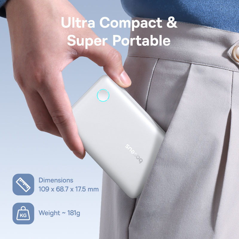 Với kích thước chỉ 109 x 68.7 x 17.5mm và trọng lượng khoảng 181g, Baseus EnerFill FP11 vô cùng nhỏ gọn và nhẹ nhàng.