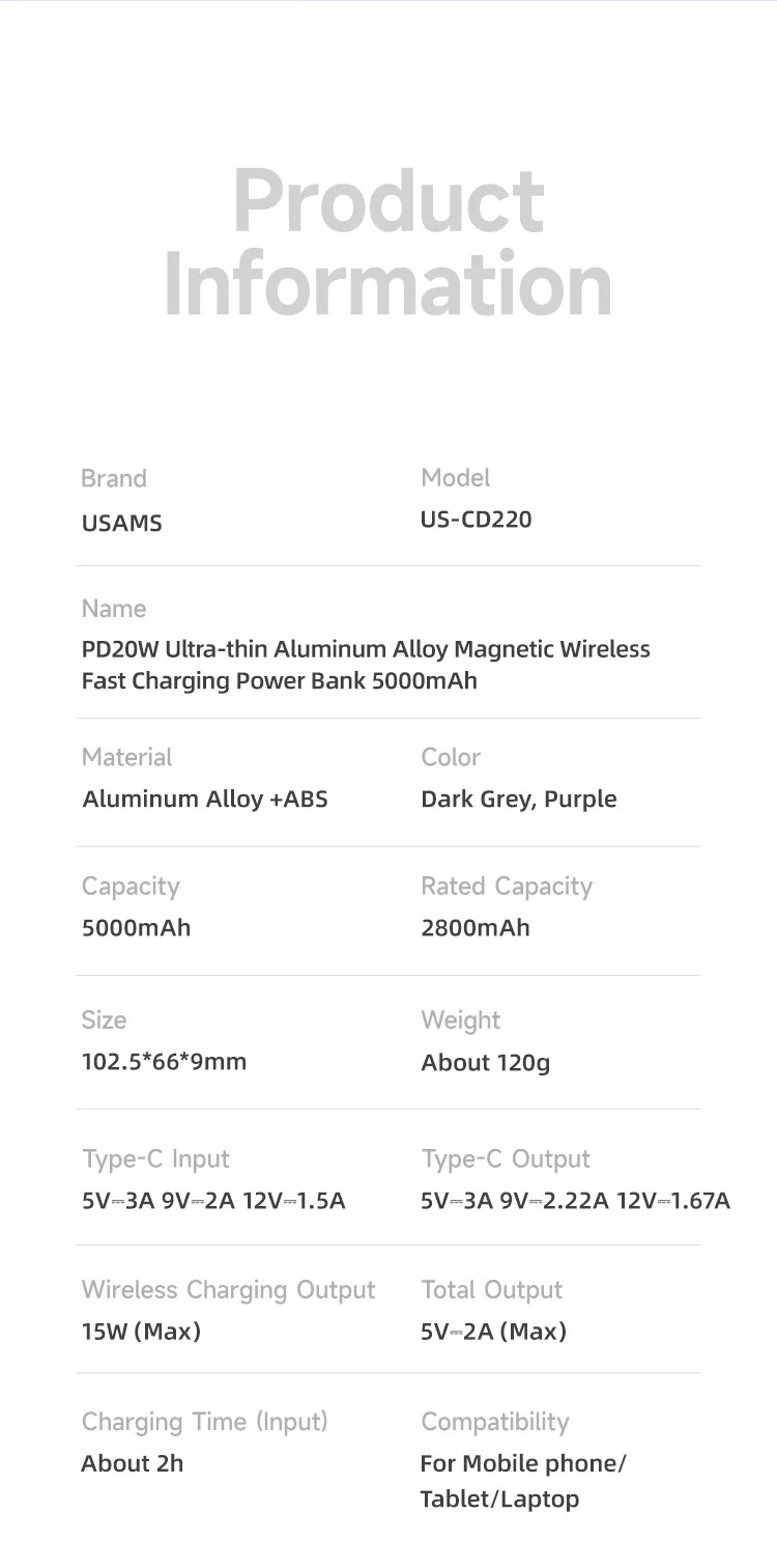 Pin Dự Phòng Không Dây Nam Châm siêu mỏng USAMS CD220 PB73 5000mAh là một phụ kiện không thể thiếu cho những tín đồ công nghệ, đặc biệt là người dùng iPhone, Samsung, Xiaomi các điện thoại Android. Với thiết kế siêu mỏng, sạc nhanh 20W và công nghệ sạc không dây từ tính, sản phẩm này mang đến trải nghiệm sạc hoàn toàn mới, tiện lợi và hiện đại.