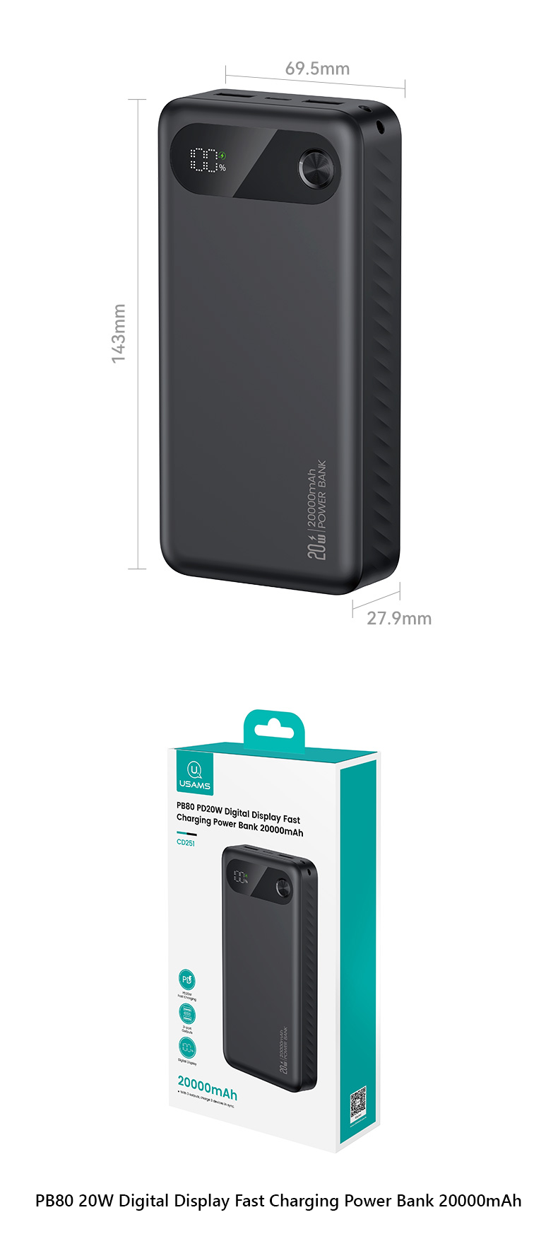 Pin Dự Phòng USAMS CD249 10000mAh/20000mAh 20W (Digital LED Display, USB + 2*Type-C Port)