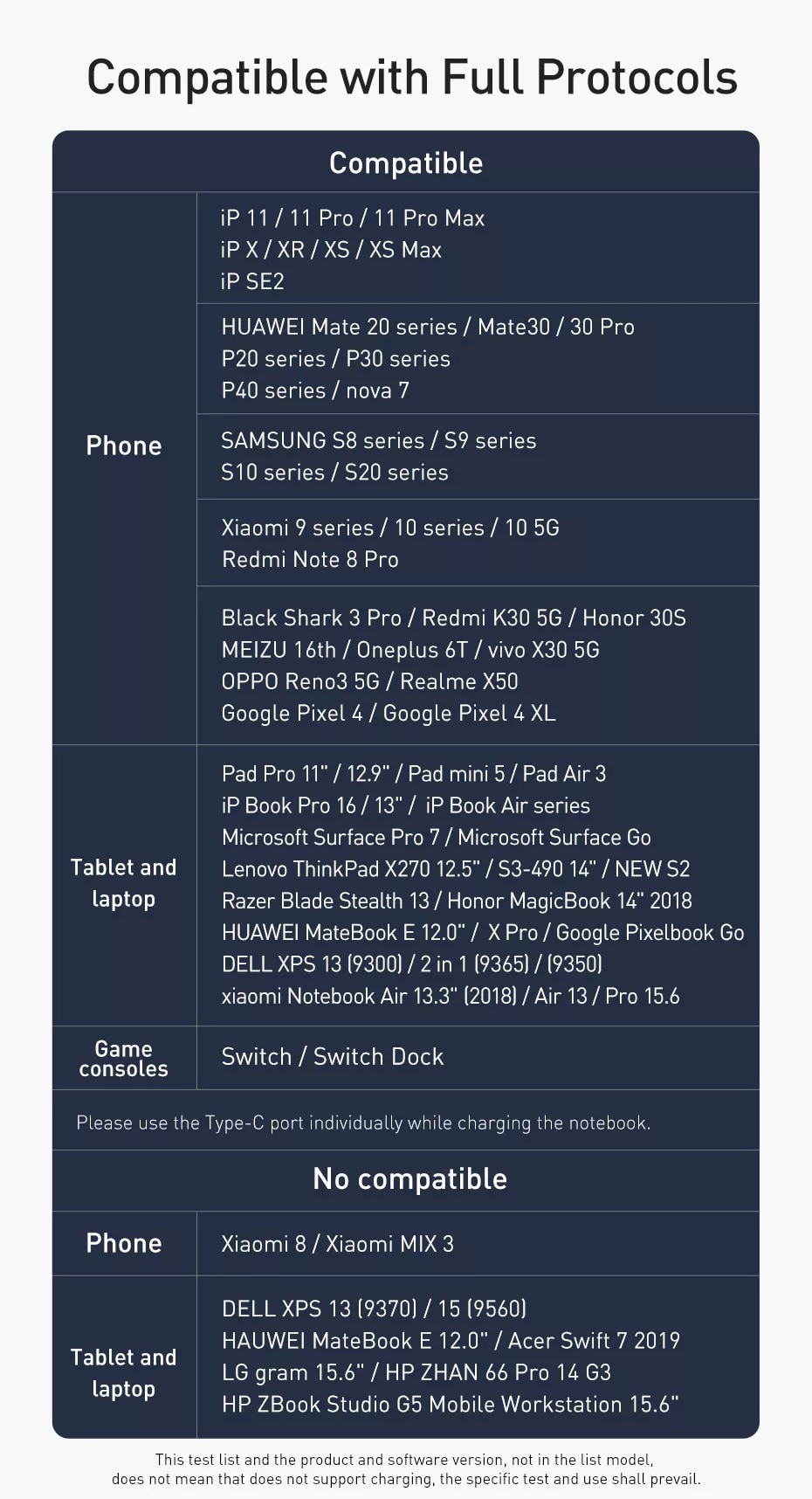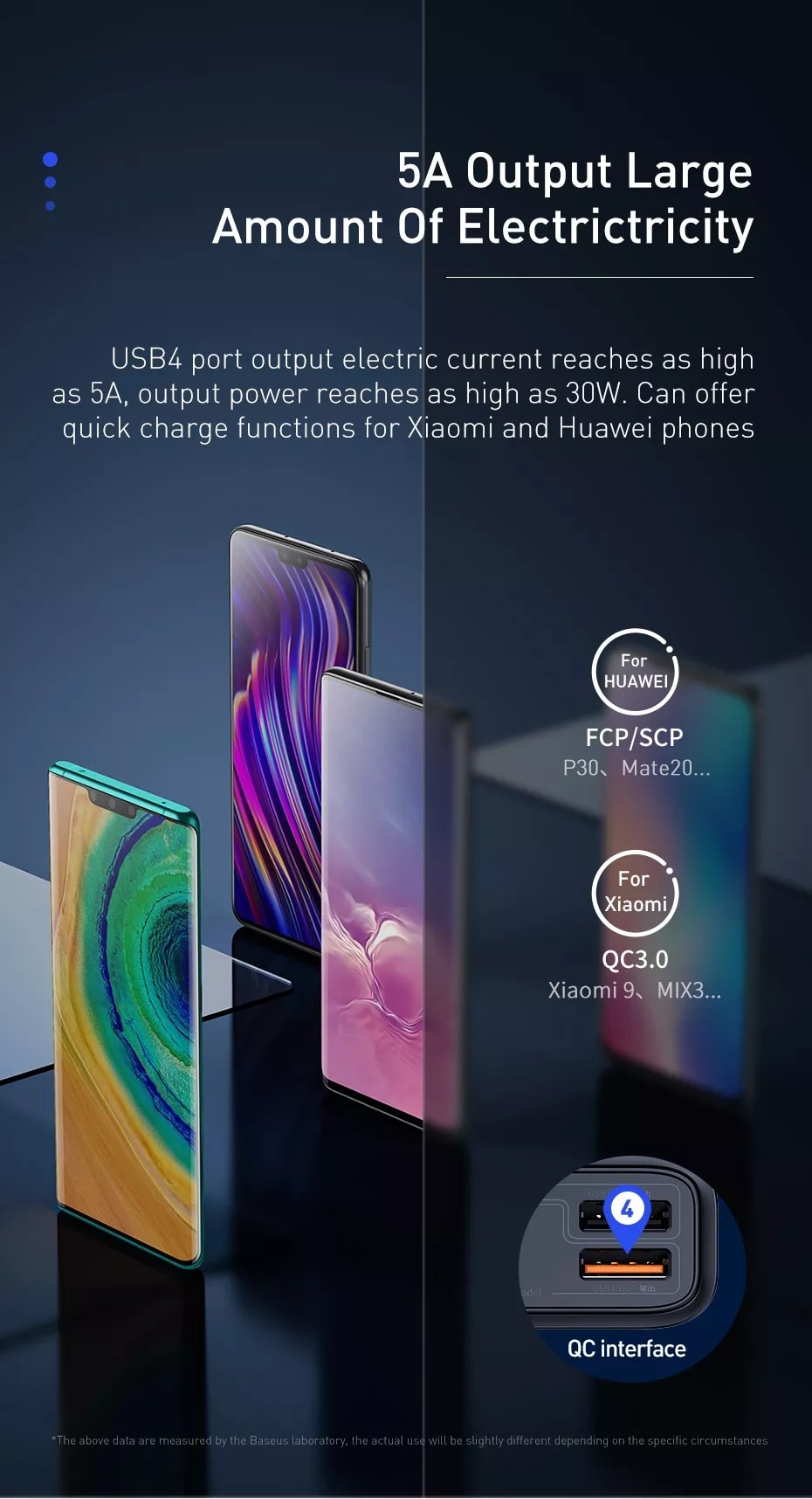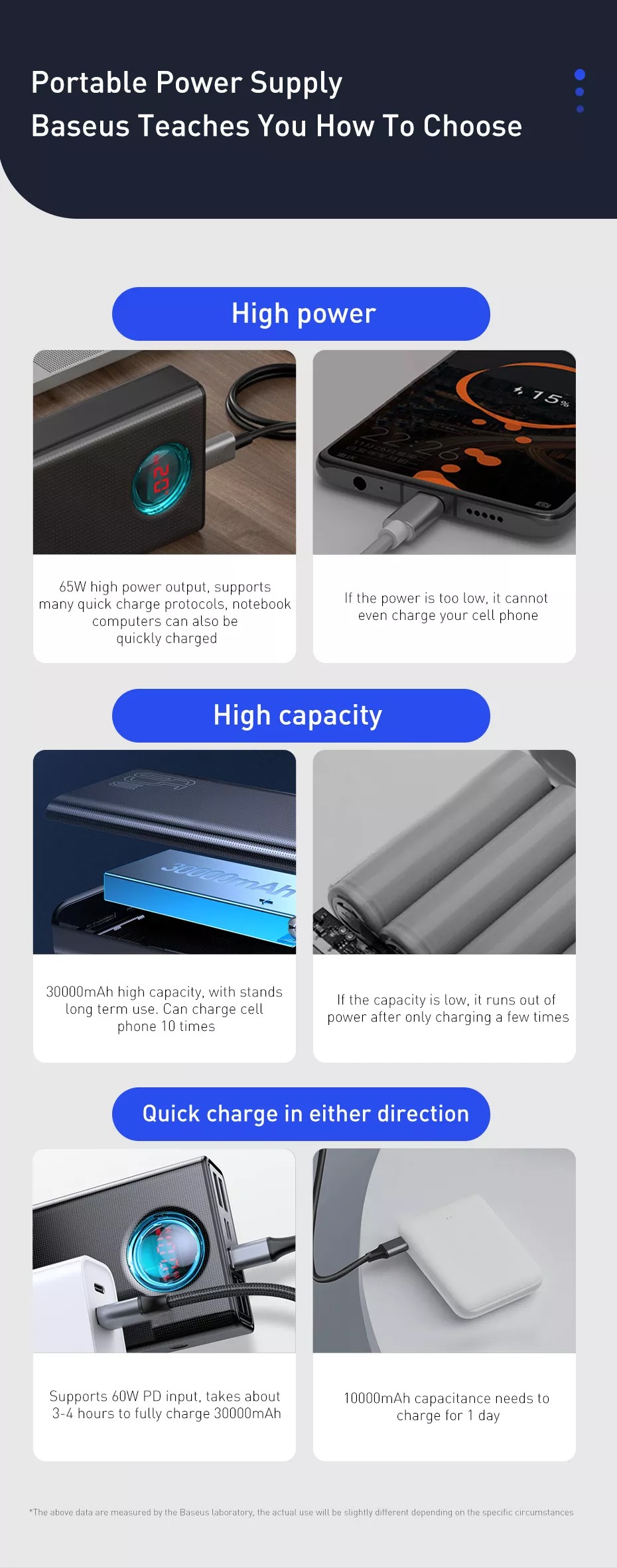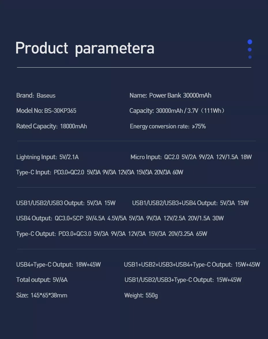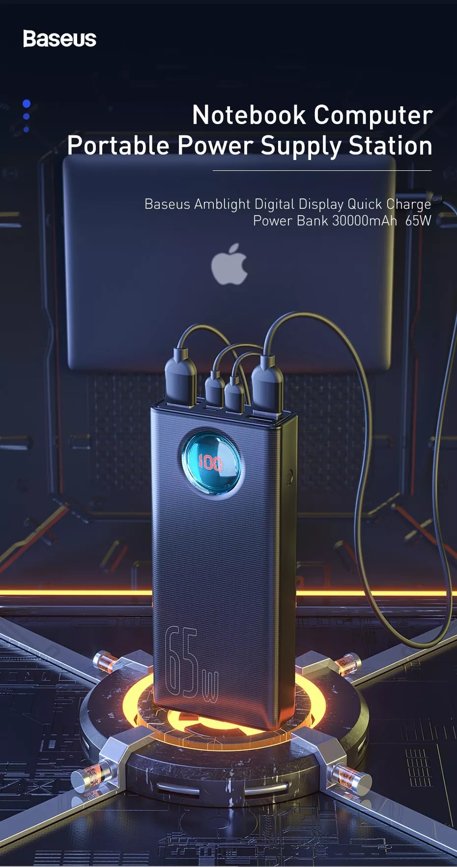 - Với số lượng cổng giao tiếp nhiều như thế cộng với dung lượng pin lên đến 30000mAh, Baseus Amblight 65W có thể sạc cùng lúc lên đến 5 thiết bị.- Sản phẩm được phân phối và bảo hành chính hãng tại Baseus Việt Nam 1 đổi 1 trong vòng 12 tháng.