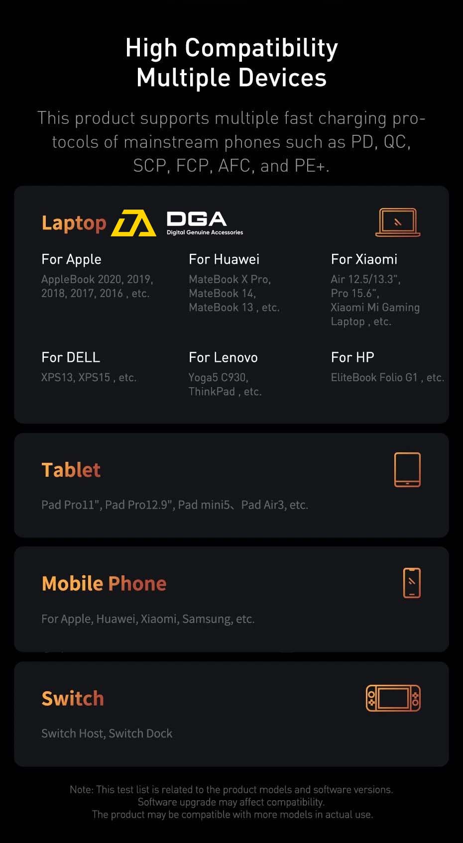 Sản phẩm này hỗ trợ nhiều giao thức sạc nhanh của điện thoại phổ thông như PD, QC, SCP, FCP, AFC và PE +