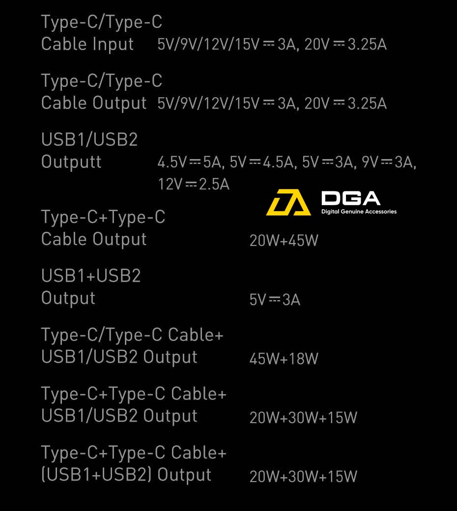 Đầu ra: - Type-C / Type-C : 5V / 9V / 12V / 15V = 3A, 20V = 3,25A - USB1 / USB2: 4.5V / 5A; 5V / 4,5A; 5V / 3A; 9V / 3A; 12V / 2.5A - Type-C + Type-C: 20W + 45W - USB1 + USB2: 5V / 3A - Type-C / Type-C + USB1 / USB2: 45W + 18W - Type-C + Type-C Cable + USB1 / USB2 : 20W + 30W + 15W - Type-C + Type-C + (USB1 + USB2): 20W + 30W + 15W