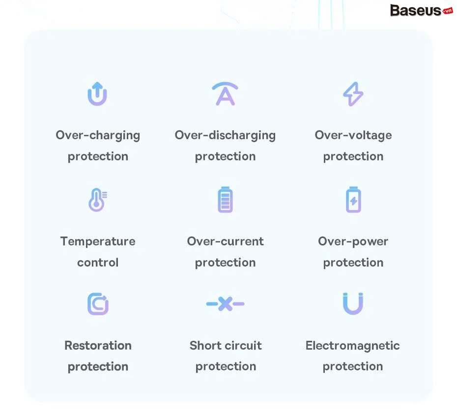 Bảo vệ quá điện áp, quá nhiệt, chống cháy nổ.
