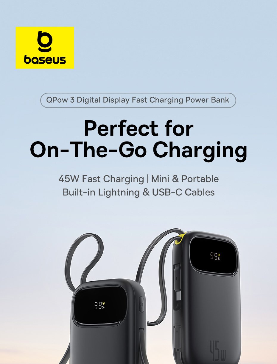 Trong kỷ nguyên di động hiện nay, người dùng smartphone luôn cần một chiếc pin dự phòng dung lượng lớn, sạc nhanh, an toàn và nhỏ gọn. Baseus EnerFill FC31 QPow 3 đáp ứng hoàn hảo mọi tiêu chí đó – với hai phiên bản 10.000mAh và 20.000mAh, công suất 45W mạnh mẽ, màn hình hiển thị số kỹ thuật số tiện ích và cáp sạc đôi USB-C + Lightning tích hợp sẵn. Đây là dòng sản phẩm lý tưởng cho người dùng iPhone, Samsung và các thiết bị công nghệ cao.