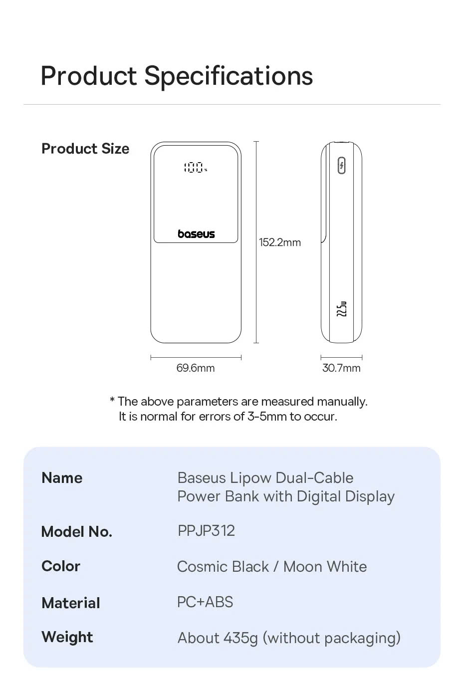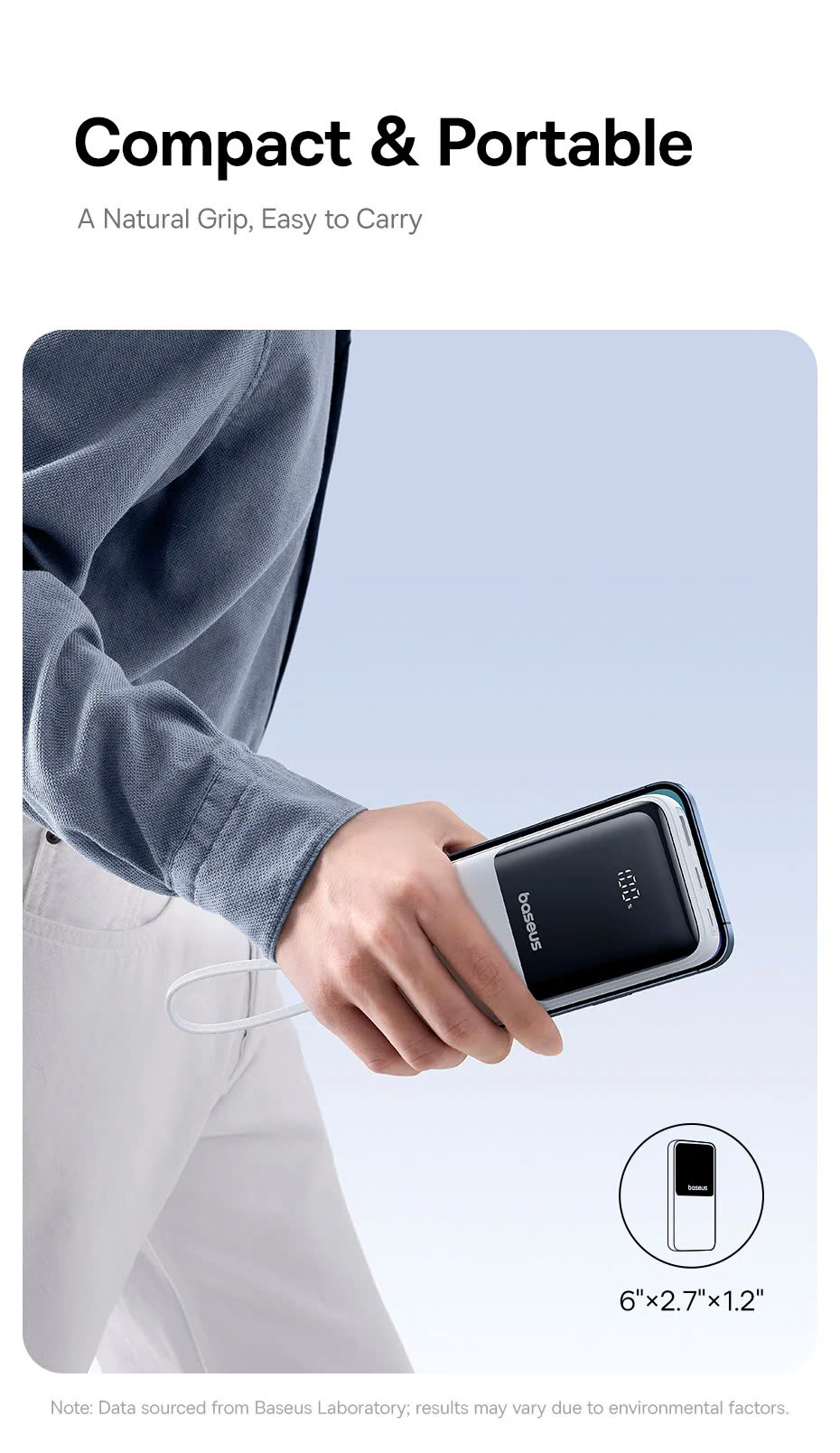 Một trong những điểm thu hút của pin sạc dự phòng Baseus Lipow Dual-Cable chính là thiết kế hiện đại và nhỏ gọn. Mặc dù có dung lượng lớn 20.000mAh, nhưng sản phẩm lại không quá cồng kềnh, giúp bạn dễ dàng mang theo bên mình mà không gây bất tiện.
