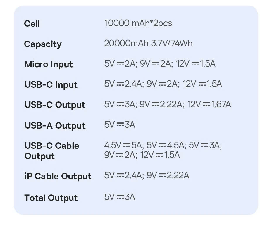 - Type-C: 20W