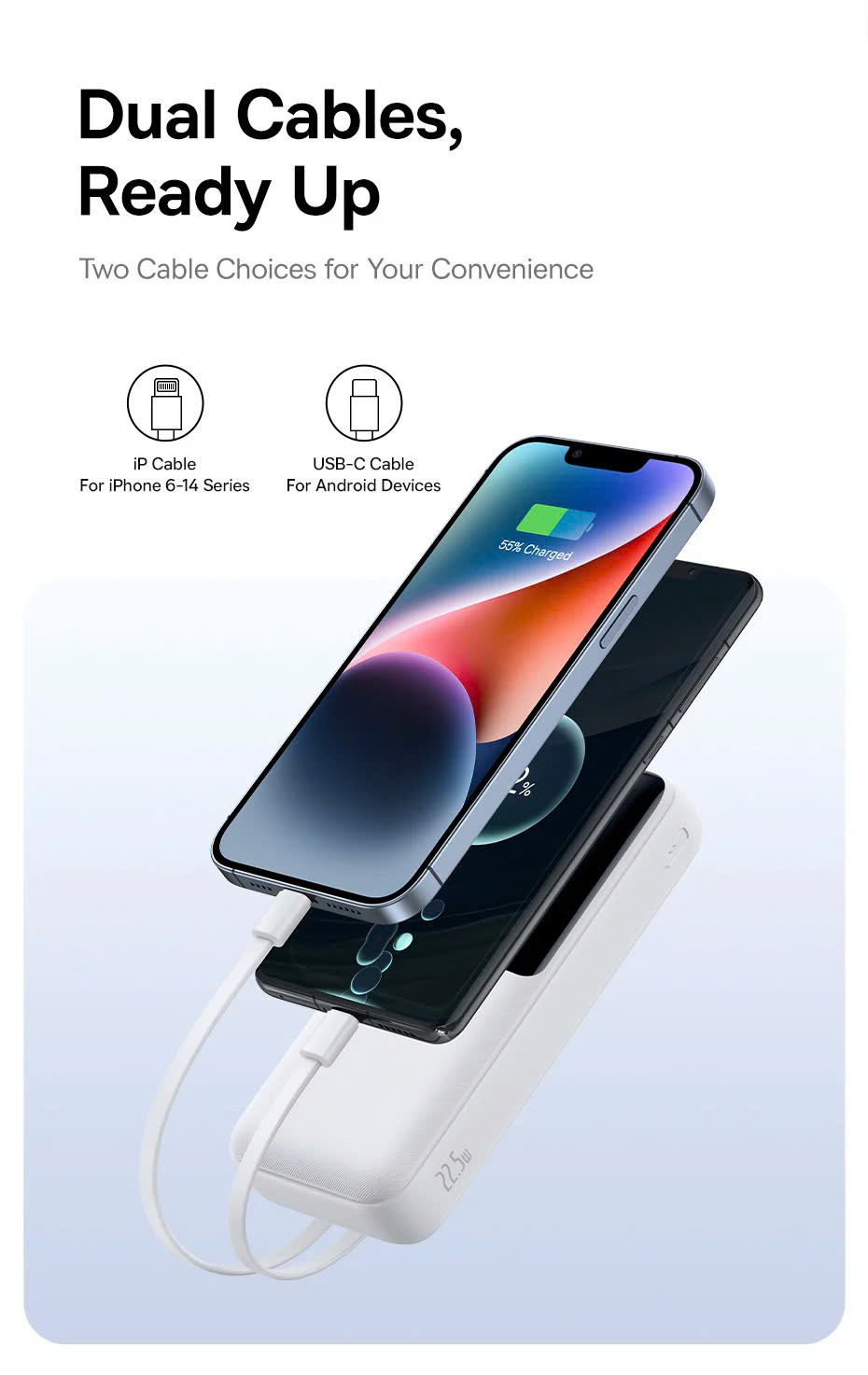 - Tích hợp cáp sạc đôi (Dual-Cable): Điểm đặc biệt của sản phẩm này là tích hợp 2 cáp sạc đi kèm ngay trên thân sạc, bao gồm cáp Lightning và USB-C, giúp tiết kiệm không gian và tiện lợi hơn khi sử dụng.