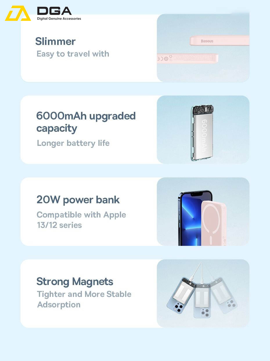 Pin Sạc Dự Phòng Không Dây Sạc Nhanh 20W Tích Hợp Nam Châm Baseus Magnetic Wireless Charging Power bank 10000mAh là một lựa chọn hoàn hảo cho những người dùng yêu thích sự tiện lợi và hiện đại. Với thiết kế nhỏ gọn, công suất sạc nhanh và tính năng tích hợp nam châm, sản phẩm này sẽ đáp ứng mọi nhu cầu sạc của bạn.