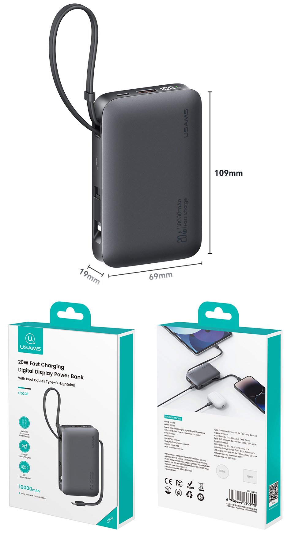 Pin sạc dự phòng USAMS CD228 20W Fast Charging Digital Display Power Bank With Type C+Lightning Cables - XR Series 10000mAh