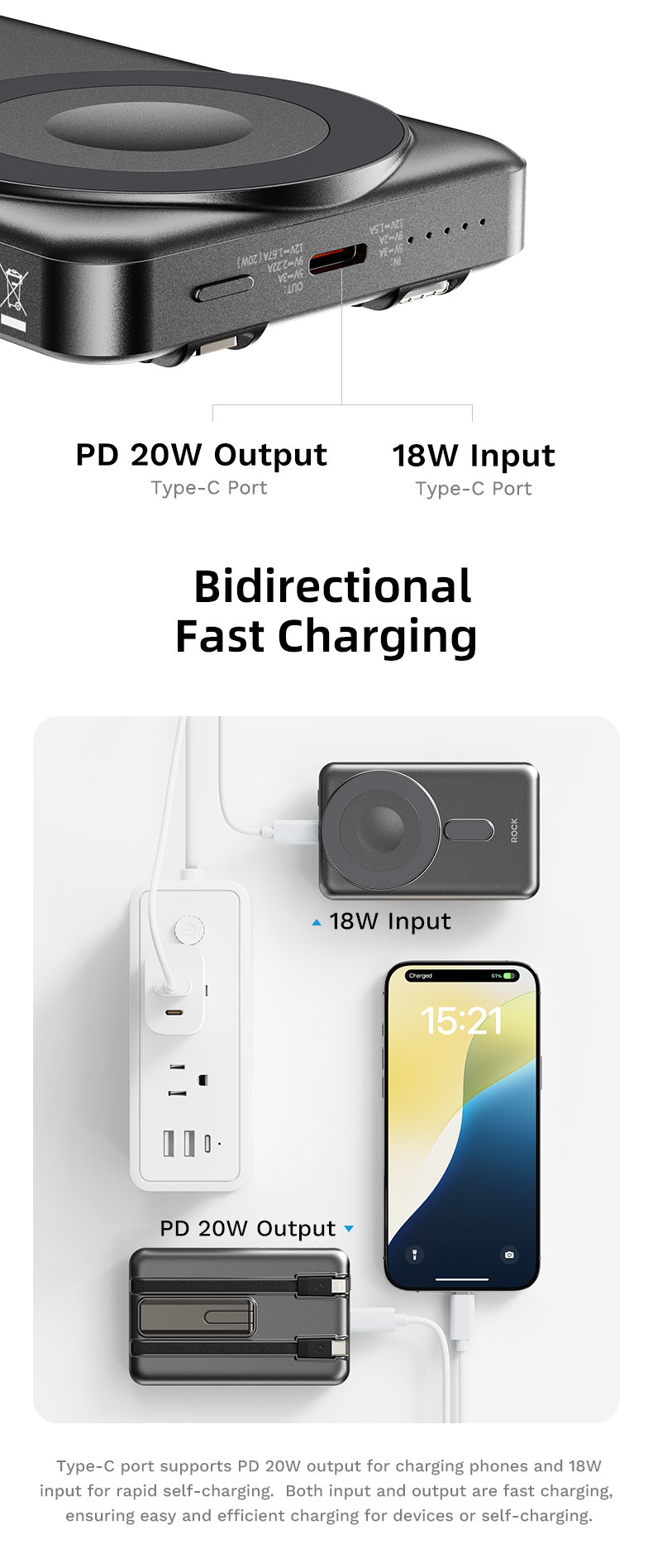 Một trong những điểm nổi bật của pin sạc không dây nam châm 5-in-1 ROCK P50 là công nghệ sạc nhanh 20W. Với công suất này, bạn có thể sạc đầy thiết bị chỉ trong thời gian ngắn, giúp bạn tiết kiệm đáng kể thời gian. Công nghệ sạc nhanh 20W hỗ trợ nhiều dòng điện thoại thông minh phổ biến, đặc biệt là các dòng iPhone và Samsung, giúp bạn luôn có năng lượng để sử dụng trong suốt cả ngày mà không phải chờ đợi lâu.