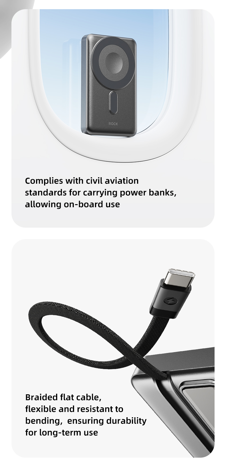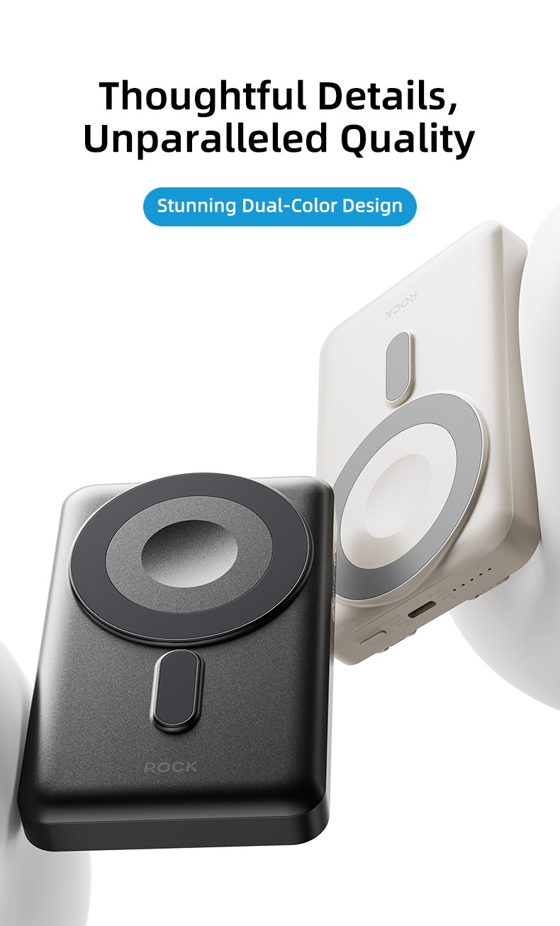 Pin sạc không dây nam châm 5-in-1 ROCK P50 có thiết kế mỏng nhẹ, giúp bạn dễ dàng mang theo trong túi xách, ba lô hoặc ví. Thiết kế nhỏ gọn này không chỉ mang lại sự tiện lợi khi di chuyển mà còn tạo cảm giác sang trọng và hiện đại. Bề mặt của sản phẩm được làm từ chất liệu cao cấp, giúp bảo vệ các linh kiện bên trong và tạo vẻ ngoài đẹp mắt, chống bám bụi và dễ dàng vệ sinh.
