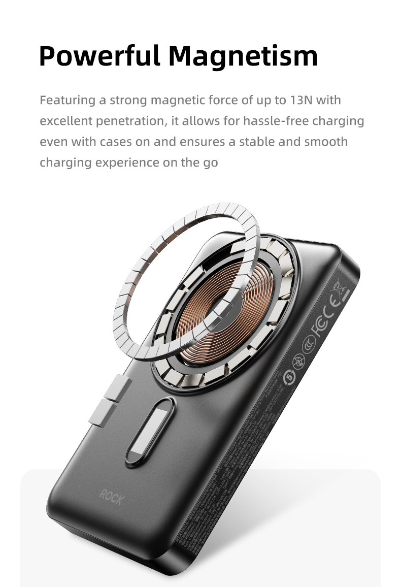 Pin sạc không dây nam châm 5-in-1 ROCK P50 sở hữu tính năng sạc không dây với nam châm tích hợp. Điều này giúp bạn dễ dàng đặt điện thoại lên pin sạc mà không cần phải lo lắng về việc kết nối dây cáp, tạo ra một trải nghiệm sạc mượt mà và không bị vướng víu. Việc sạc không dây trở nên đơn giản hơn bao giờ hết nhờ vào khả năng giữ chặt điện thoại với nam châm mạnh mẽ, giúp điện thoại không bị di chuyển trong quá trình sạc.