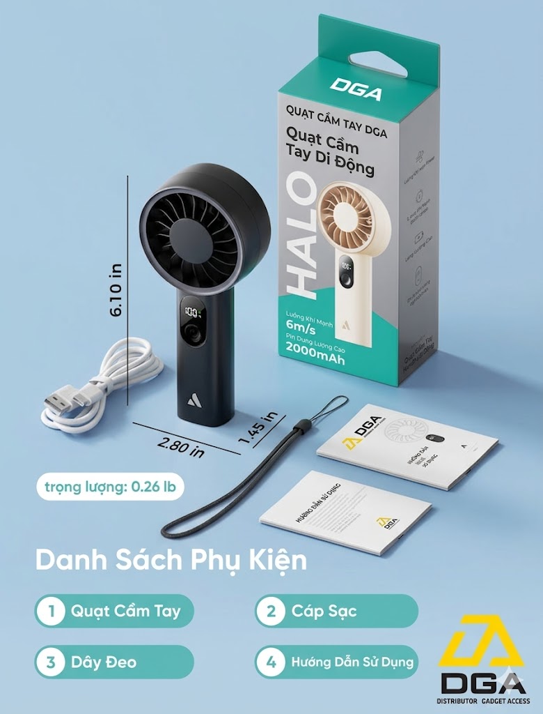 Pin 2000mAh, thời gian dùng đến 10.5 giờ: Ở mức gió thấp, quạt có thể hoạt động đến 10.5 giờ, ở mức gió cao thời gian khoảng 1.7–3 giờ, đủ dùng cho một ngày di chuyển, đi học, đi làm hoặc dạo phố