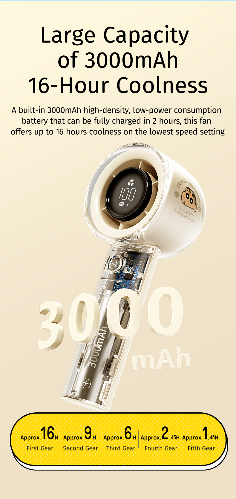 Với dung lượng pin 3000mAh, Quạt Cầm Tay ROCK Crayon Shinchan F11 cho phép sử dụng lên đến 16 giờ sau mỗi lần sạc đầy. Dù bạn đang đi chơi, đi dã ngoại hay làm việc trong mùa hè nóng bức, bạn đều có thể yên tâm sử dụng mà không lo lắng về vấn đề hết pin. Đặc biệt, tốc độ sạc nhanh chính là một điểm cộng lớn giúp bạn tiết kiệm thời gian.