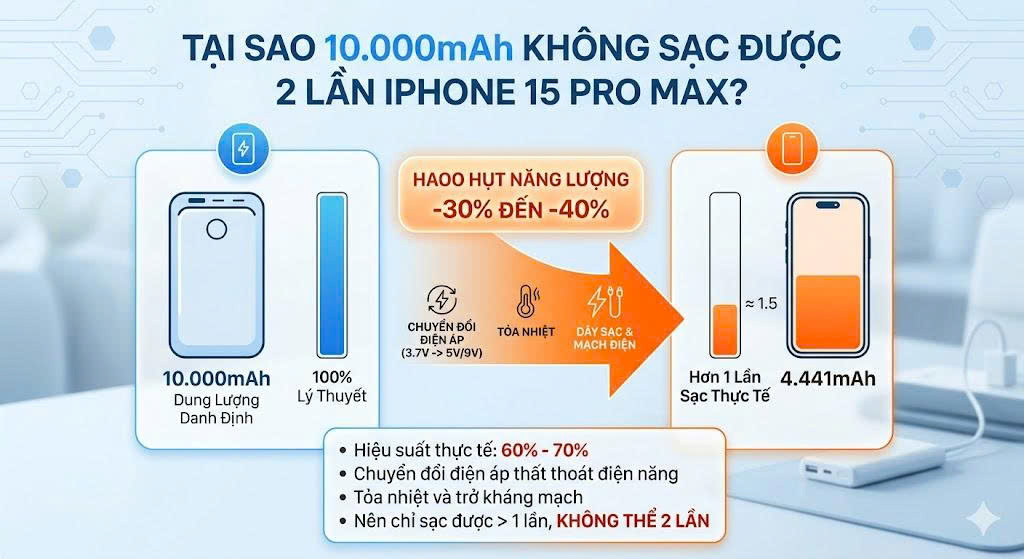 Trong thế giới phụ kiện công nghệ, con số 10.000mAh trên vỏ hộp sạc dự phòng luôn là tâm điểm chú ý. Tuy nhiên, rất nhiều người dùng iPhone 15 Pro Max cảm thấy hụt hẫng khi thực tế sử dụng không như mong đợi. Liệu có phải nhà sản xuất đang "lừa dối" khách hàng? Hay có một sự hao hụt năng lượng bí ẩn nào đó?