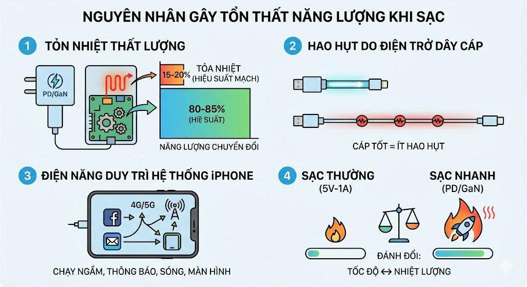 Sạc nhanh giúp tiết kiệm thời gian nhưng lại gây hao hụt năng lượng cao hơn do tỏa nhiệt nhiều hơn so với sạc thường 5V-1A cũ kỹ. Tuy nhiên, đây là sự đánh đổi xứng đáng để lấy sự tiện lợi.