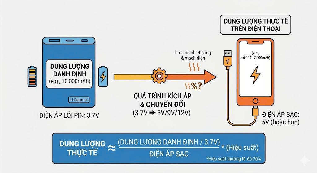 Dung lượng thực tế = (Dung lượng danh định / 3.7V) / 5V