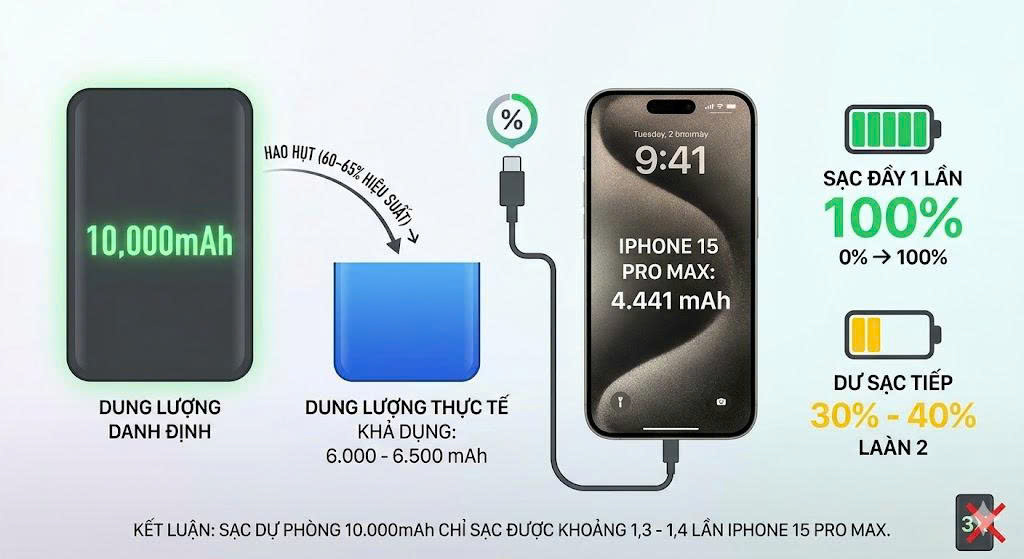 Sạc dự phòng 10.000mAh sạc được mấy lần iPhone 15 Pro Max? Sự thật về hiệu suất thực tế