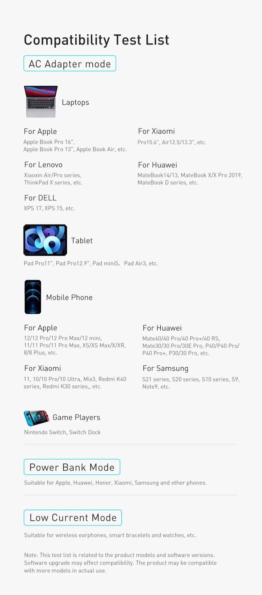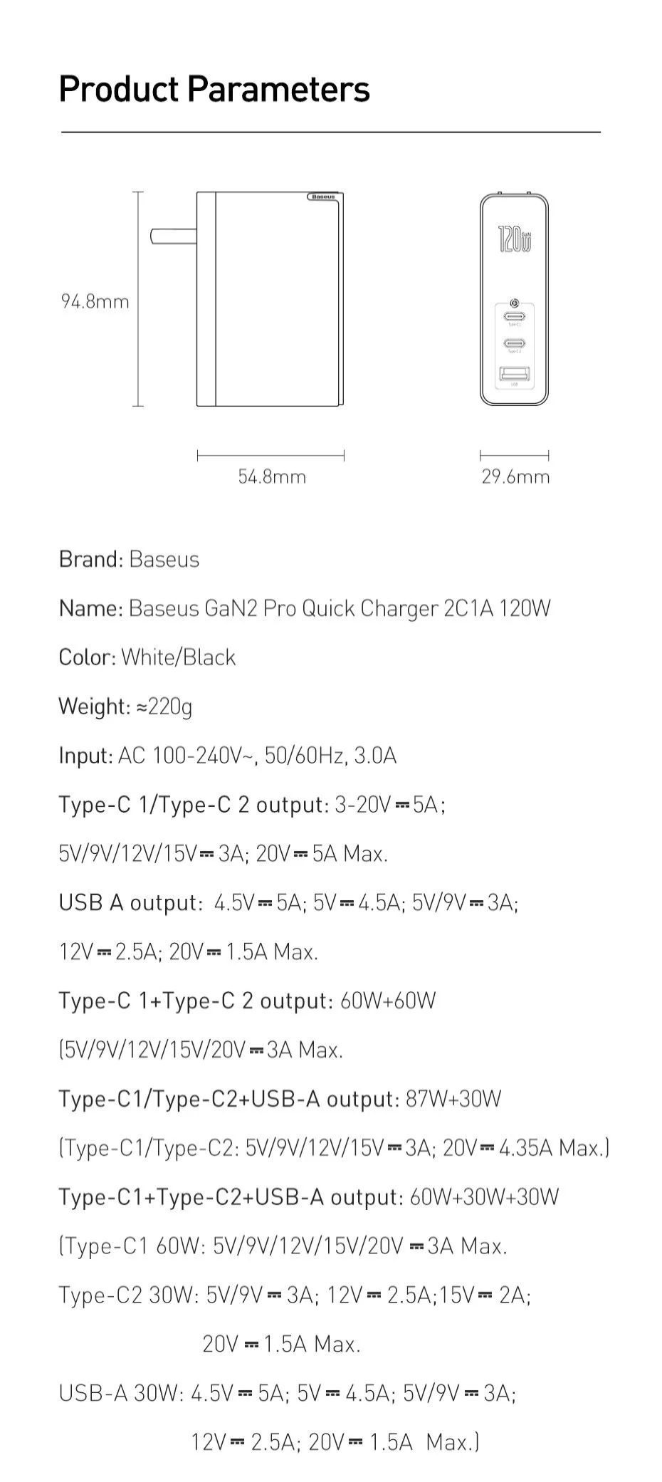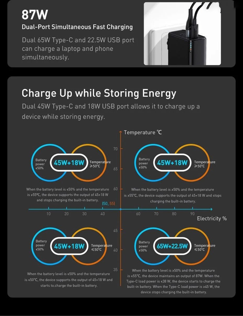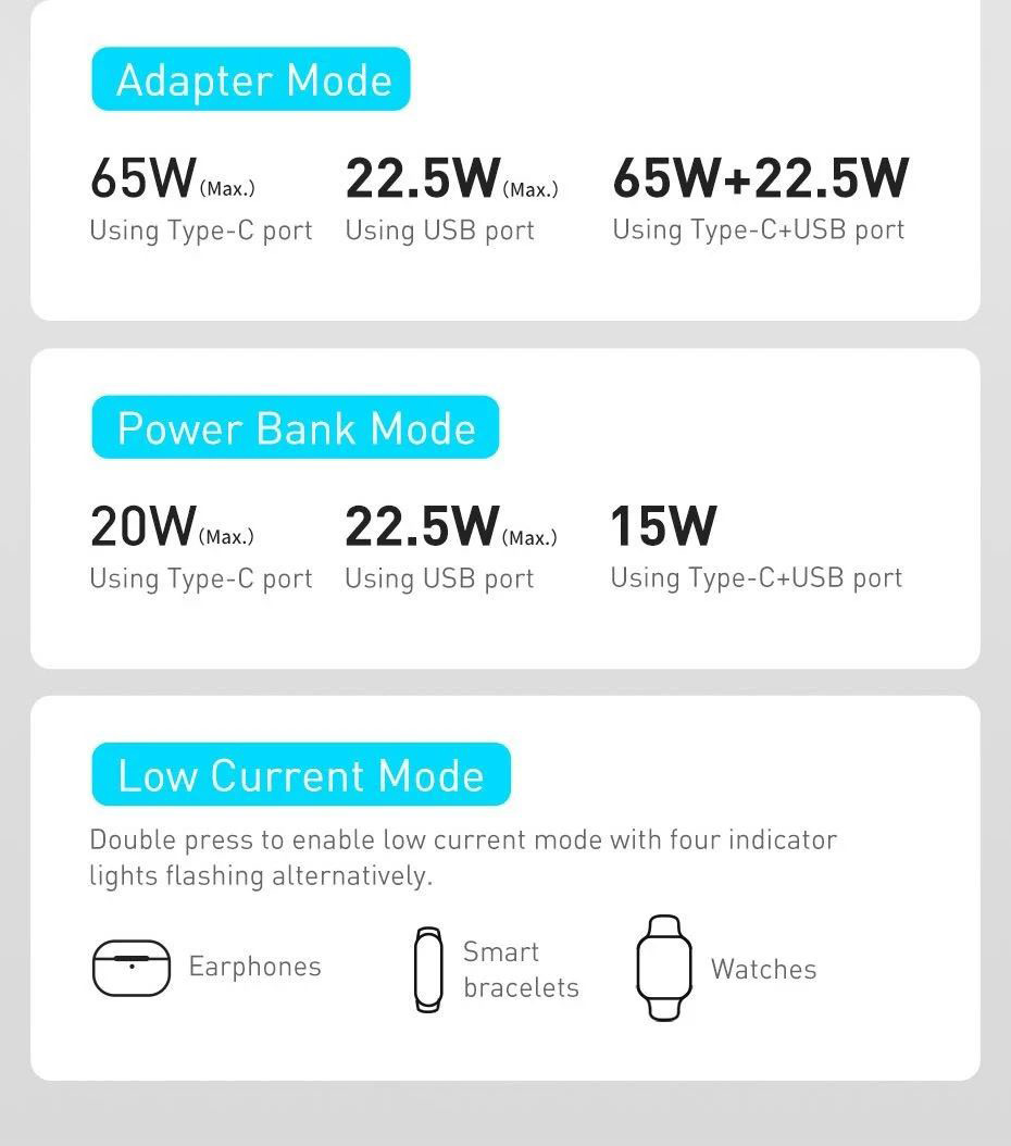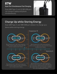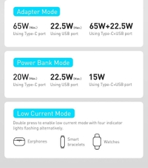 - Chế độ cắm nguồn trực tiếp: Type C Output : 5V/3A, 9V/3A, 12V/3A, 15V/3A, 20V/3.25AUSB-A Output : 4.5V/5A, 5V/3A, 9V/2A, 12V/1.5AType C + USB-A Output : 65W +22.5W