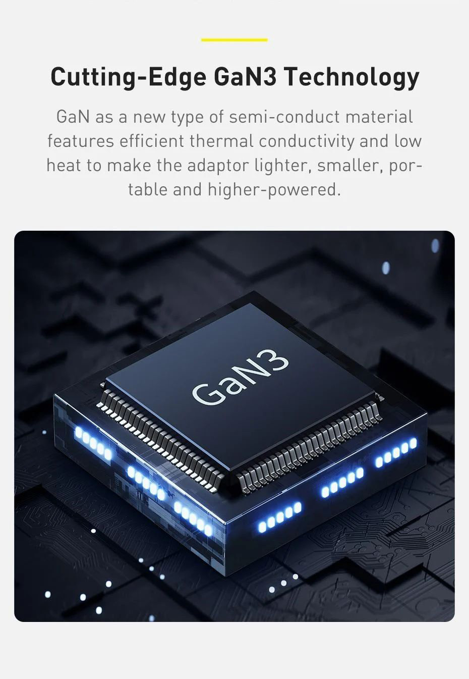 – GaN hay Gallium Nitride là một hợp chất bán dẫn có mặt từ năm 1990, là một trong những chất bán dẫn phổ biến nhất bên cạnh Silicon. Tuy vậy, GaN lại có những ưu điểm vượt trội Silicon nhờ khả năng chịu nhiệt tốt hơn, có thể chịu điện năng cao và độ di động điện tử cao gấp nhiều lần.