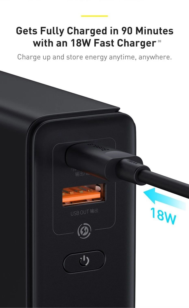 – Khi ở chế độ AC,cổng type C Output ra tới 65w và cổng USB-A lên tới 22.5w.Khi ở chế độ pin dự phòng,cổng type C Output ra 45w và USB-A là 18w.Dễ dàng sạc IPhone 12 vỏn vẹn trong 1h30p.