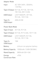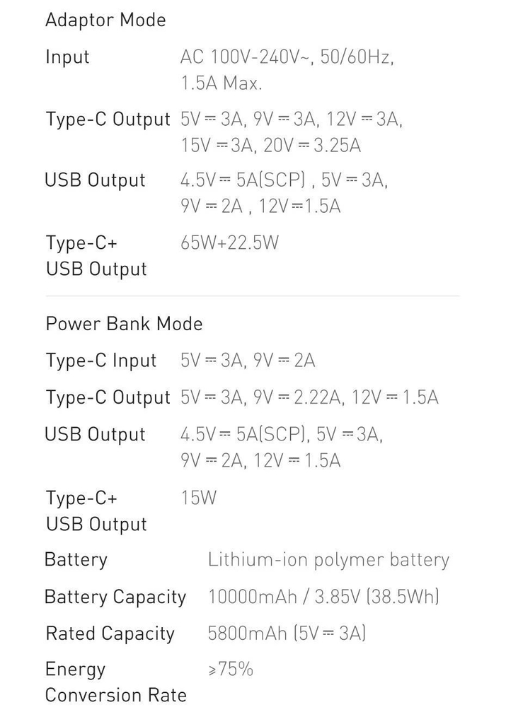 - Chế độ pin dự phòng:Type C Input: 5V/3A, 9V/2AType C Output : 5V/3A, 9V/2.22A, 12V/1.5AUSB-A Output :4.5V/5A, 5V/3A, 9V/2A, 12V/1.5AType C + USB-A Output 15W