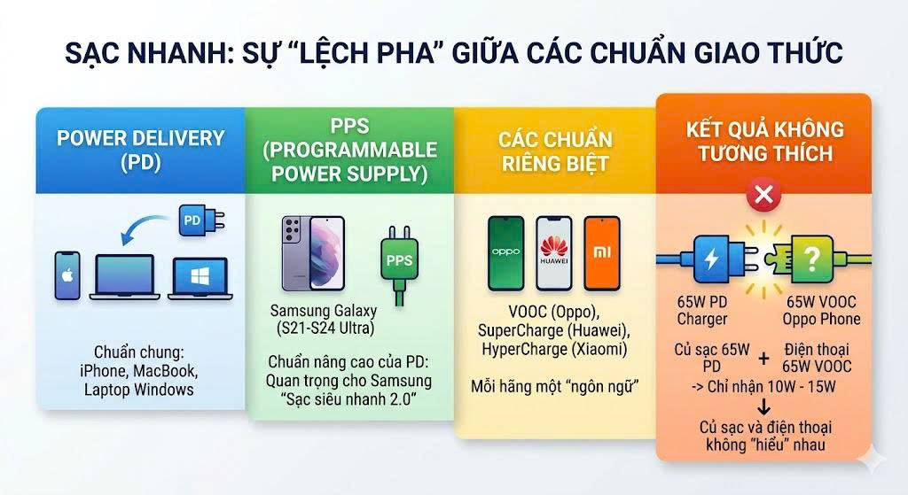 Sự "lệch pha" giữa các chuẩn giao thức sạc nhanh