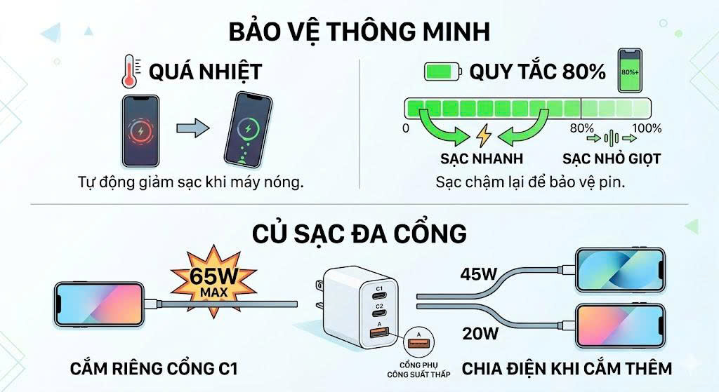 Cơ chế chia điện: Khi bạn cắm cổng C1, công suất có thể đạt tối đa 65W. Nhưng khi cắm thêm một chiếc tai nghe vào cổng C2, củ sạc sẽ tự động chia lại dòng điện, ví dụ thành 45W + 20W.