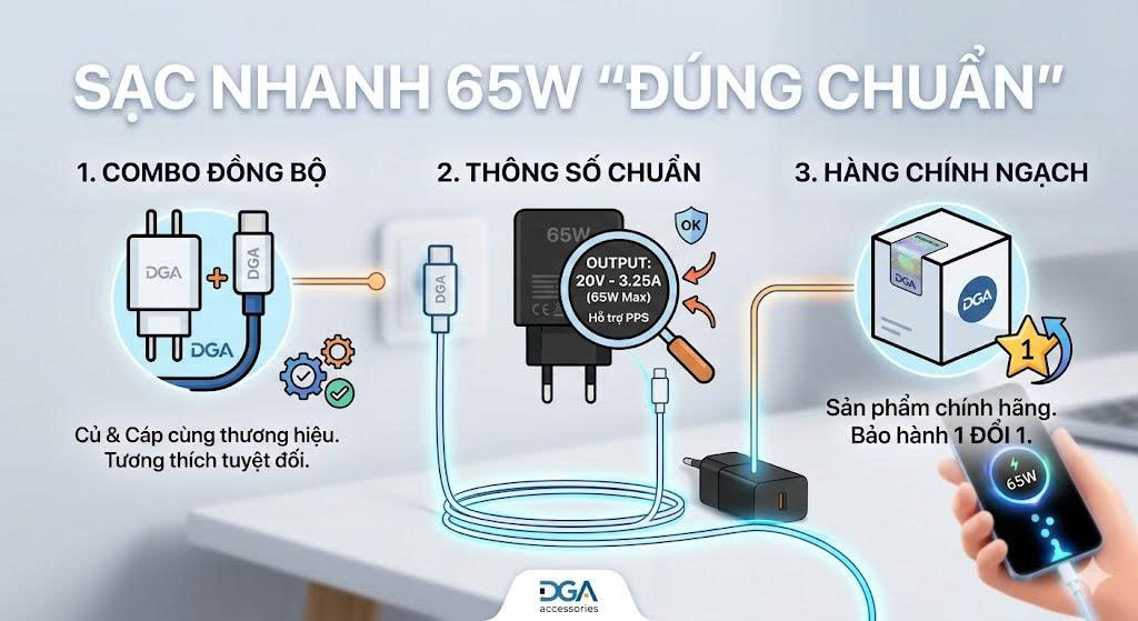 Thị trường hiện nay tràn lan các củ sạc 65W "giá rẻ" với linh kiện bên trong kém chất lượng. Những sản phẩm này không chỉ sạc chậm mà còn tiềm ẩn nguy cơ loạn cảm ứng, hỏng IC nguồn. Việc lựa chọn các đơn vị phân phối chính ngạch như DGA không chỉ giúp bạn có được công suất sạc thật mà còn đi kèm với chế độ bảo hành lỗi 1 đổi 1, bảo vệ túi tiền và thiết bị của bạn.