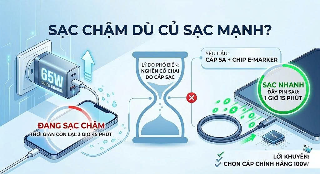 Sạc nhanh 65W nhưng máy vẫn báo sạc chậm thường xuất phát từ sự thiếu đồng bộ giữa Củ sạc - Cáp sạc - Thiết bị. Chỉ cần thay đổi một sợi cáp chuẩn 5A hoặc chọn đúng cổng sạc ưu tiên, bạn đã có thể tận hưởng tốc độ sạc tia chớp.