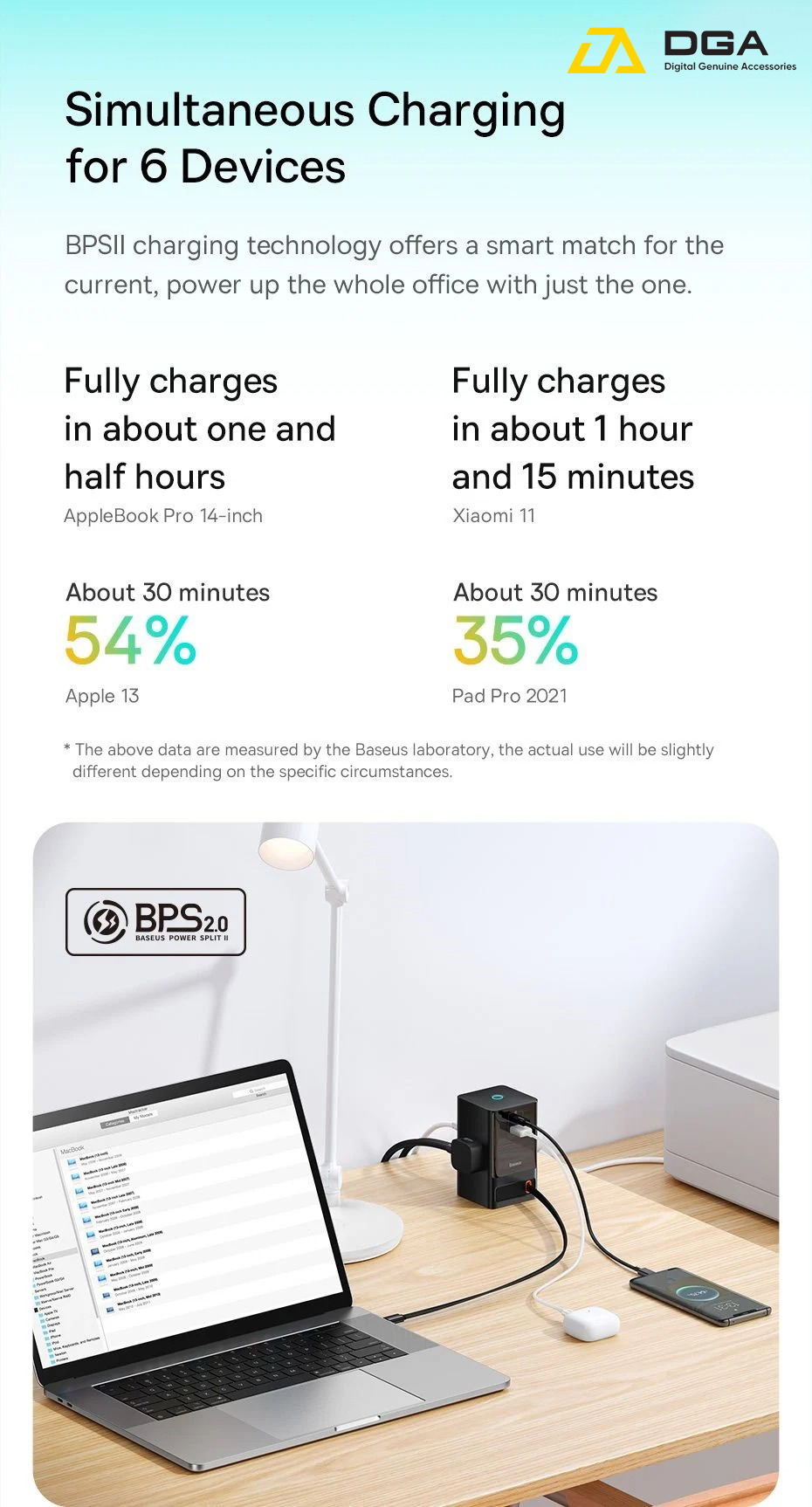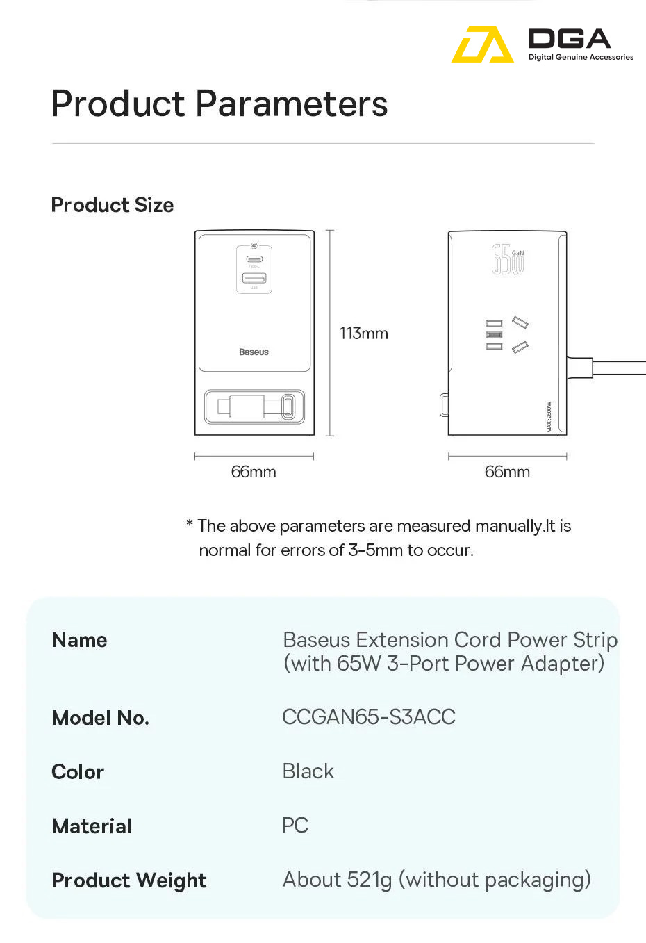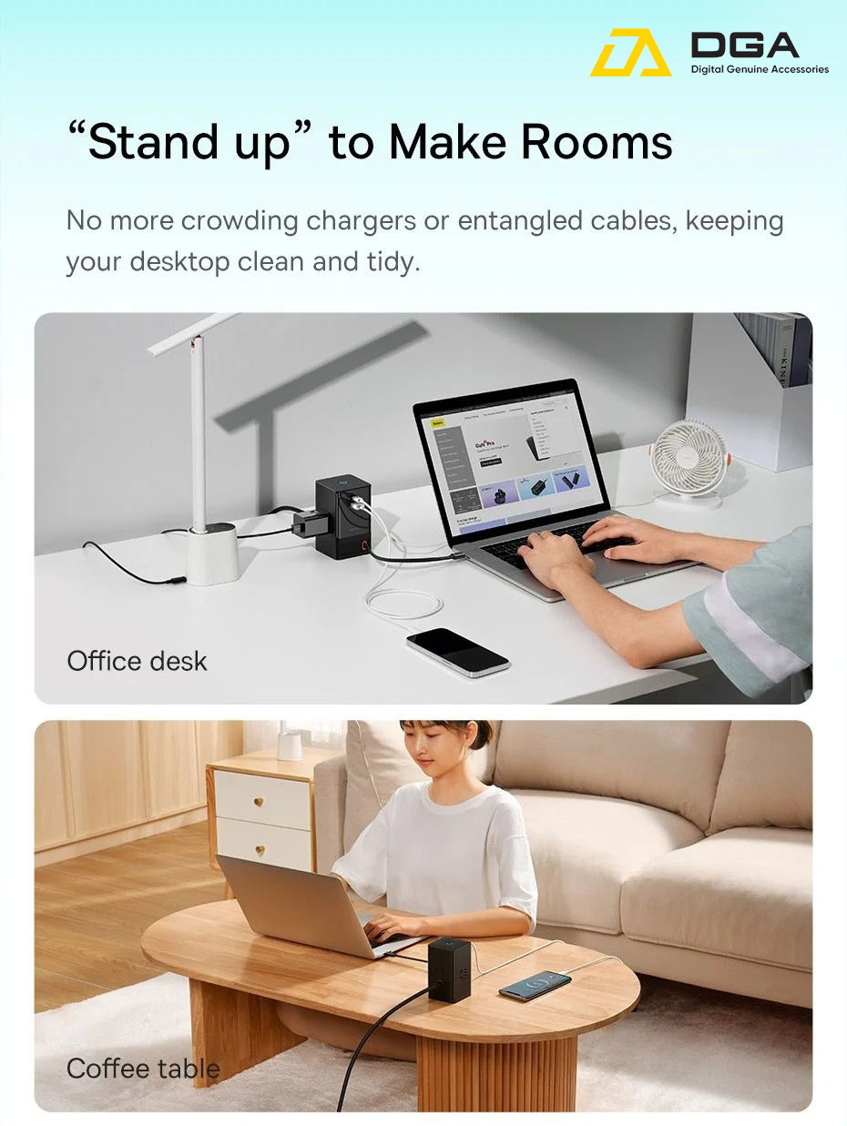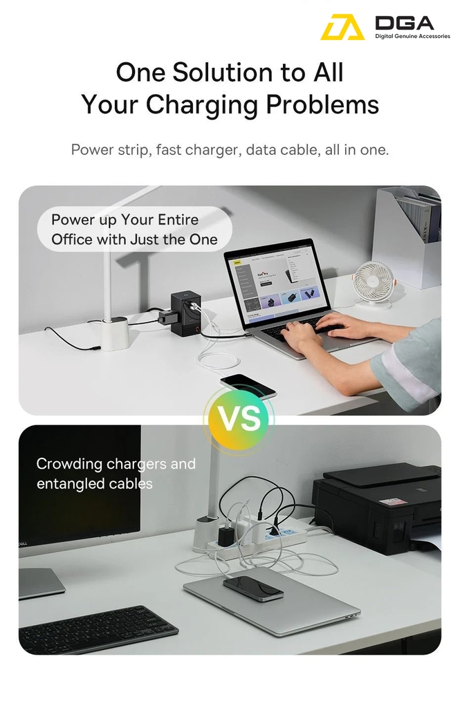 Với việc tích hợp dây dẫn nguồn AC nối dài kèm theo 3 ổ cắm điện AC, Baseus PowerCombo Digital Powerstrip không chỉ là một củ sạc đa năng mà nó còn được sử dụng như một ổ cắm điện thông minh, đáp ứng mọi nhu cầu và không gian làm việc của bạn. Chỉ với Baseus PowerCombo Digital PowerStrip có thể đảm bảo cấp nguồn cho tất cả các thiết bị của bạn từ AC đến DC.