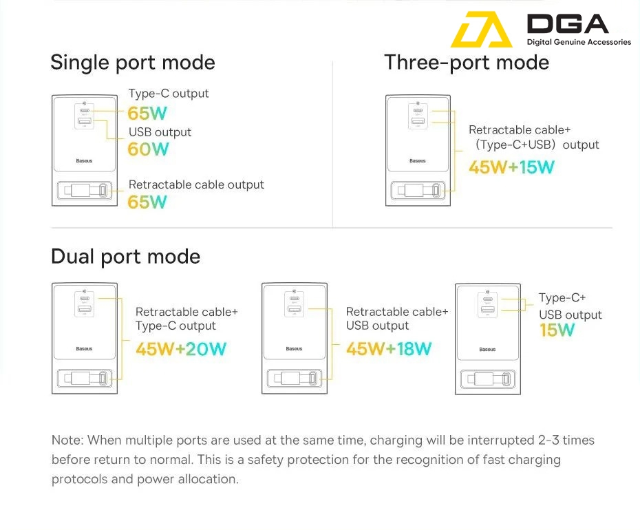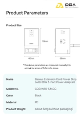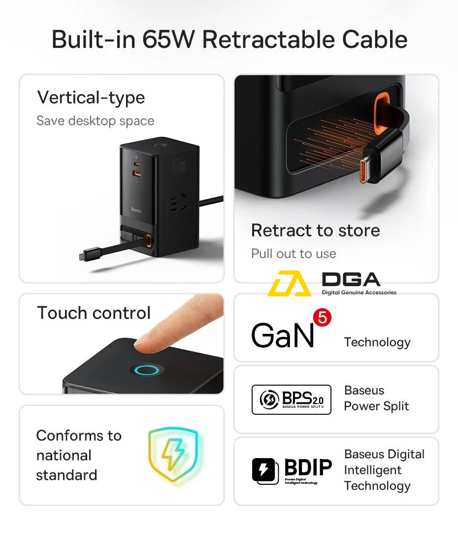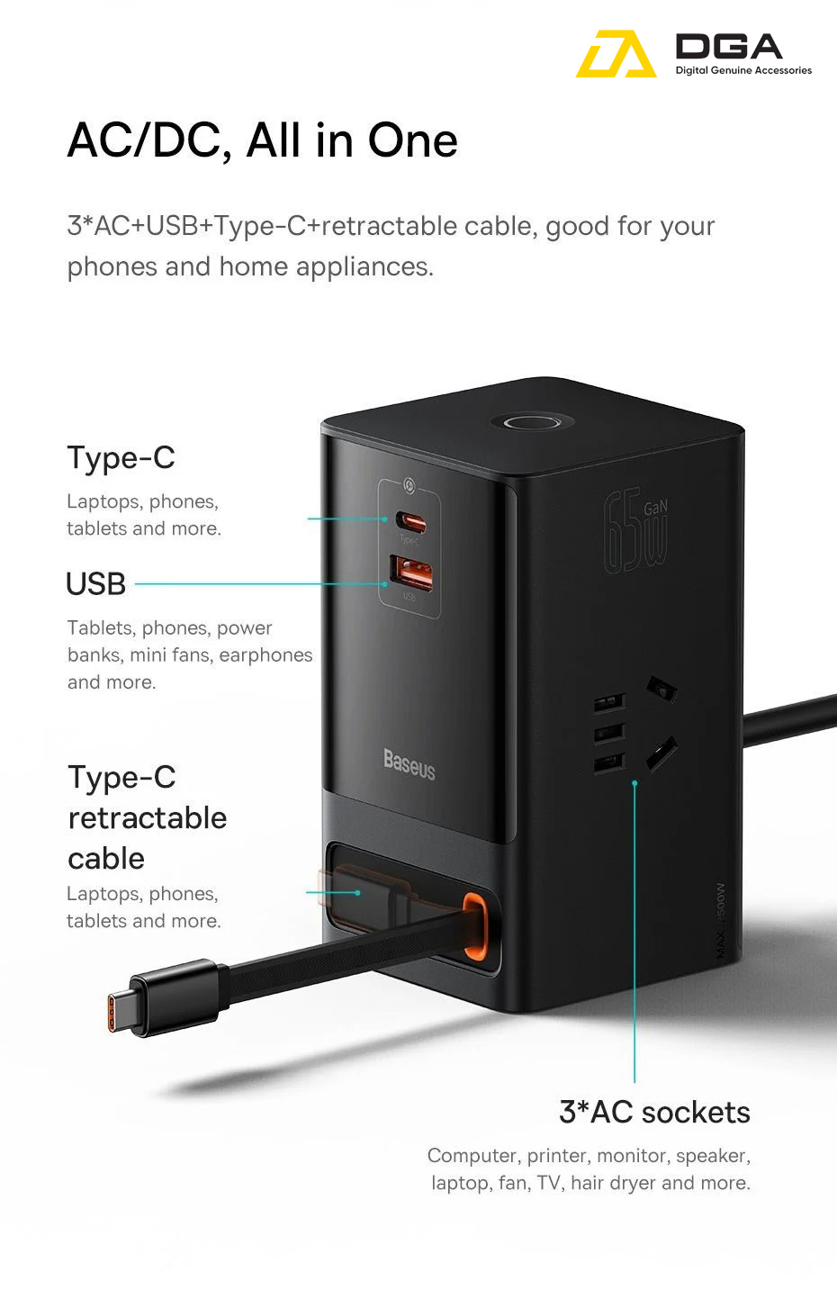 Tính Năng Bộ Sạc Nhanh 65W Tích Hợp Dây Nguồn Nối Dài Baseus PowerCombo Digital PowerStrip 3AC+1U+1C+Retractable-C 65W