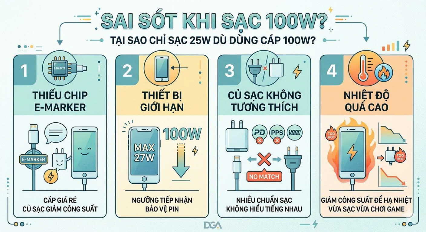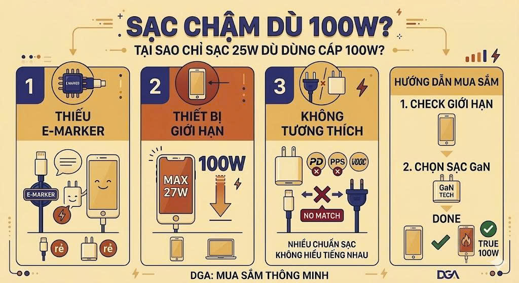 "Sự Thật Về Con Số 100W": Tại Sao Bạn Mua Cáp 100W Nhưng Sạc Mãi Chỉ Lên Được 25W?