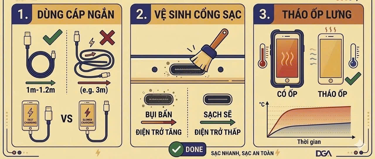 Tháo ốp lưng khi sạc nặng: Nếu bạn đang dùng các tác vụ nặng hoặc sạc từ mức pin cực thấp, hãy tháo ốp lưng để thiết bị tản nhiệt tốt hơn, giúp duy trì công suất sạc cao lâu hơn.