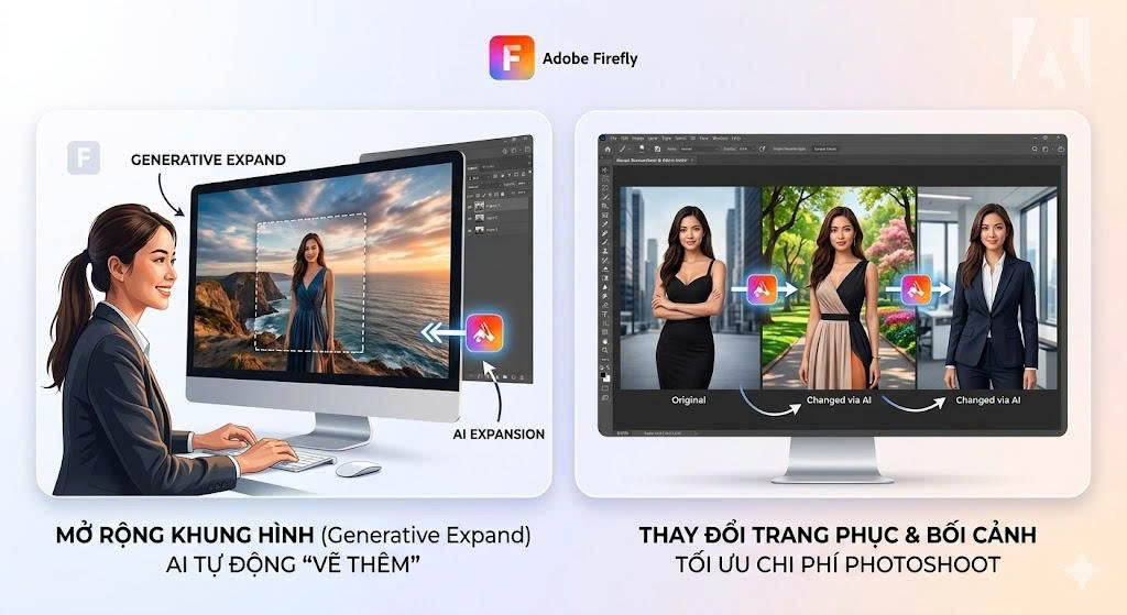 Không thể không nhắc đến "ông lớn" Adobe. Sự tích hợp của Firefly vào Photoshop (Generative Fill) đã thay đổi định nghĩa về chỉnh sửa ảnh chuyên nghiệp.