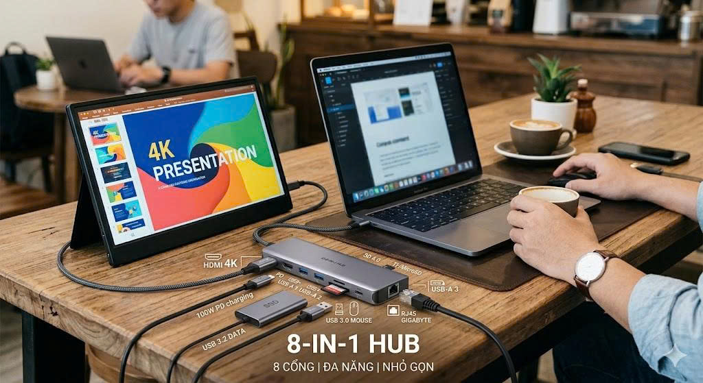Sự gọn gàng: Thay vì một túi đựng đầy dây nhợ, bạn chỉ cần một chiếc Hub duy nhất. Điều này giúp không gian làm việc tại quán cafe – vốn nhỏ hẹp – trở nên chuyên nghiệp và thoáng đạt hơn, tạo cảm hứng sáng tạo.